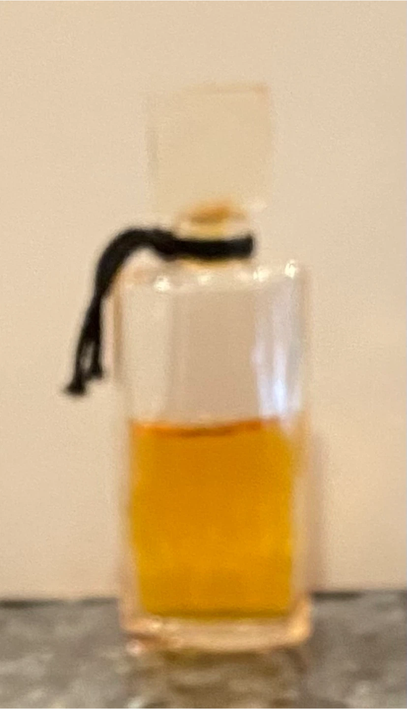 Here's a vintage Bob Mackie Splash perfume mini/travel bottle. It has a unique design with a clear glass body and a decorative black cord around the neck. The perfume inside has a golden hue, adding to its vintage charm