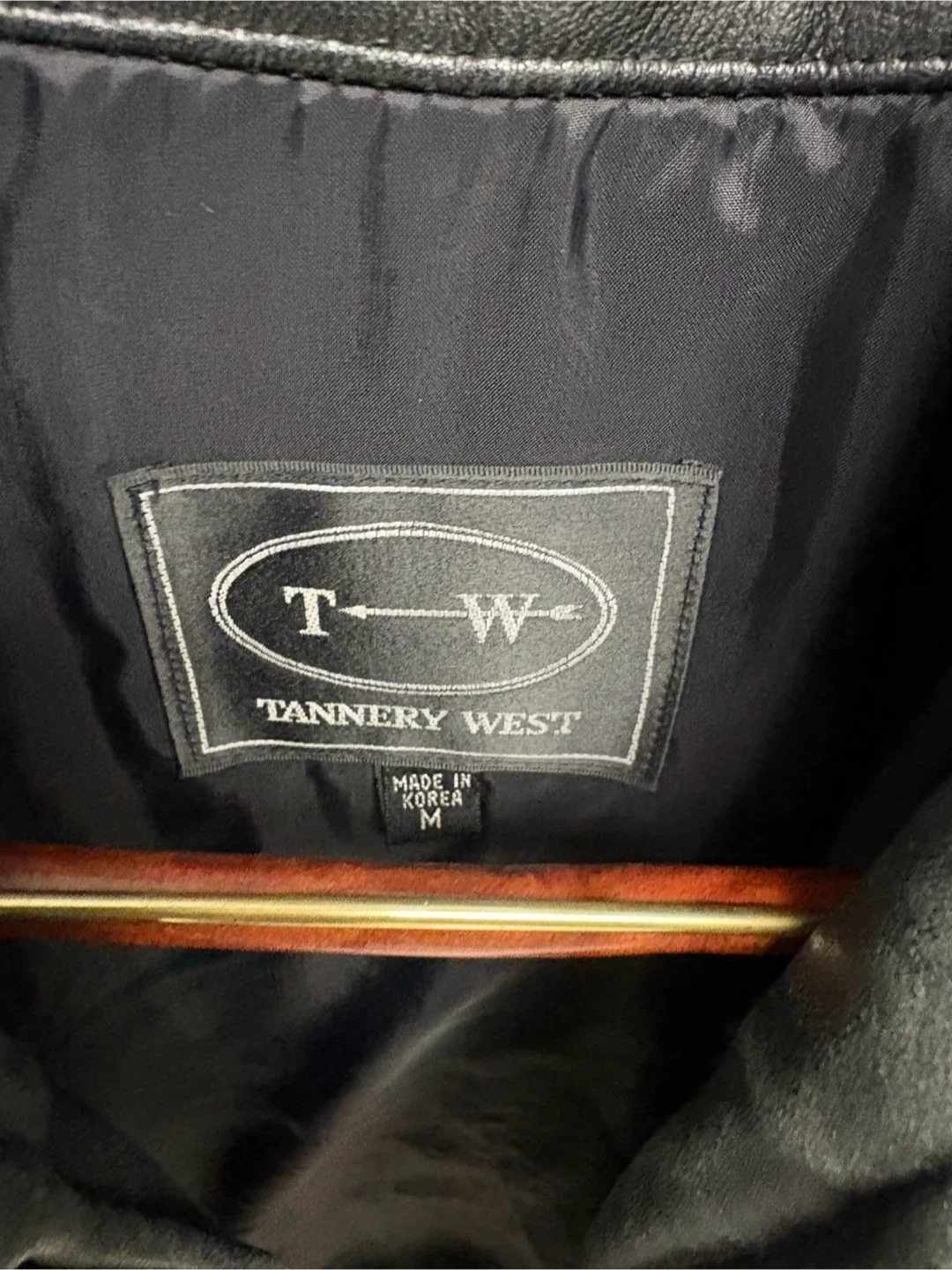 Selling a Tannery West leather jacket in size medium. It's a stylish black jacket that would be a great addition to your wardrobe. Please note that it is recommended to send to a special leather cleaner only
