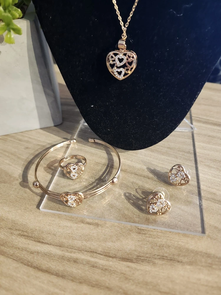 Selling a lovely heart design jewellery set! Includes a necklace, bracelet, ring, and earrings. Perfect for adding a touch of sparkle to any outfit