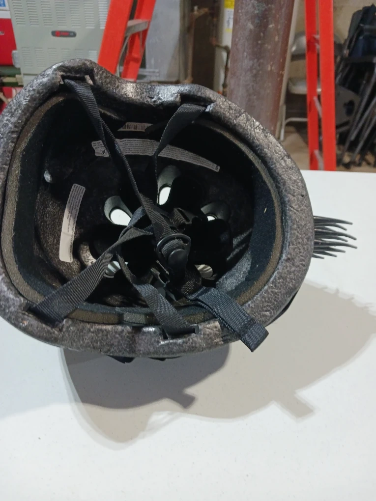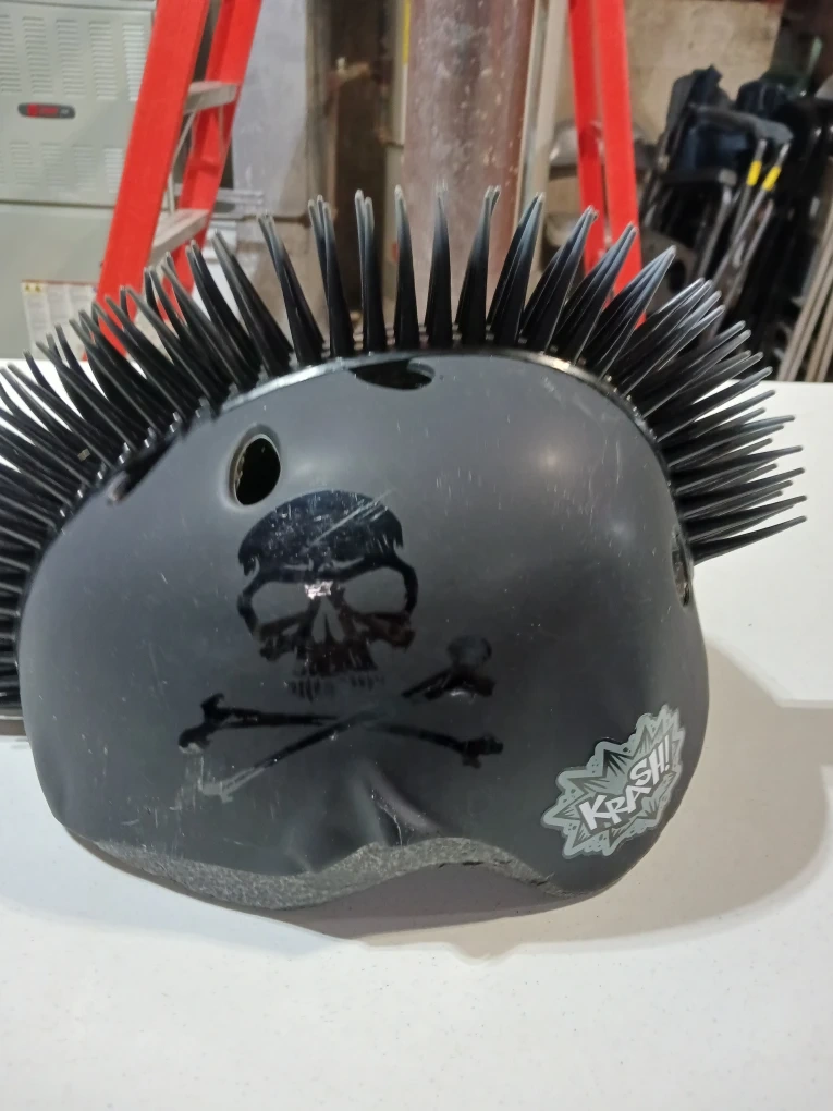 Selling a Krash! brand helmet. It's black and has a mohawk. It also has a skull and crossbones design on the front. It's in good condition and ready for a new owner!