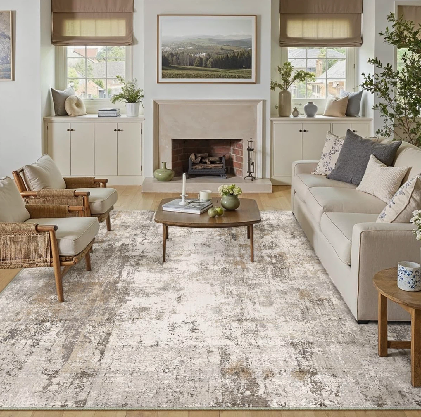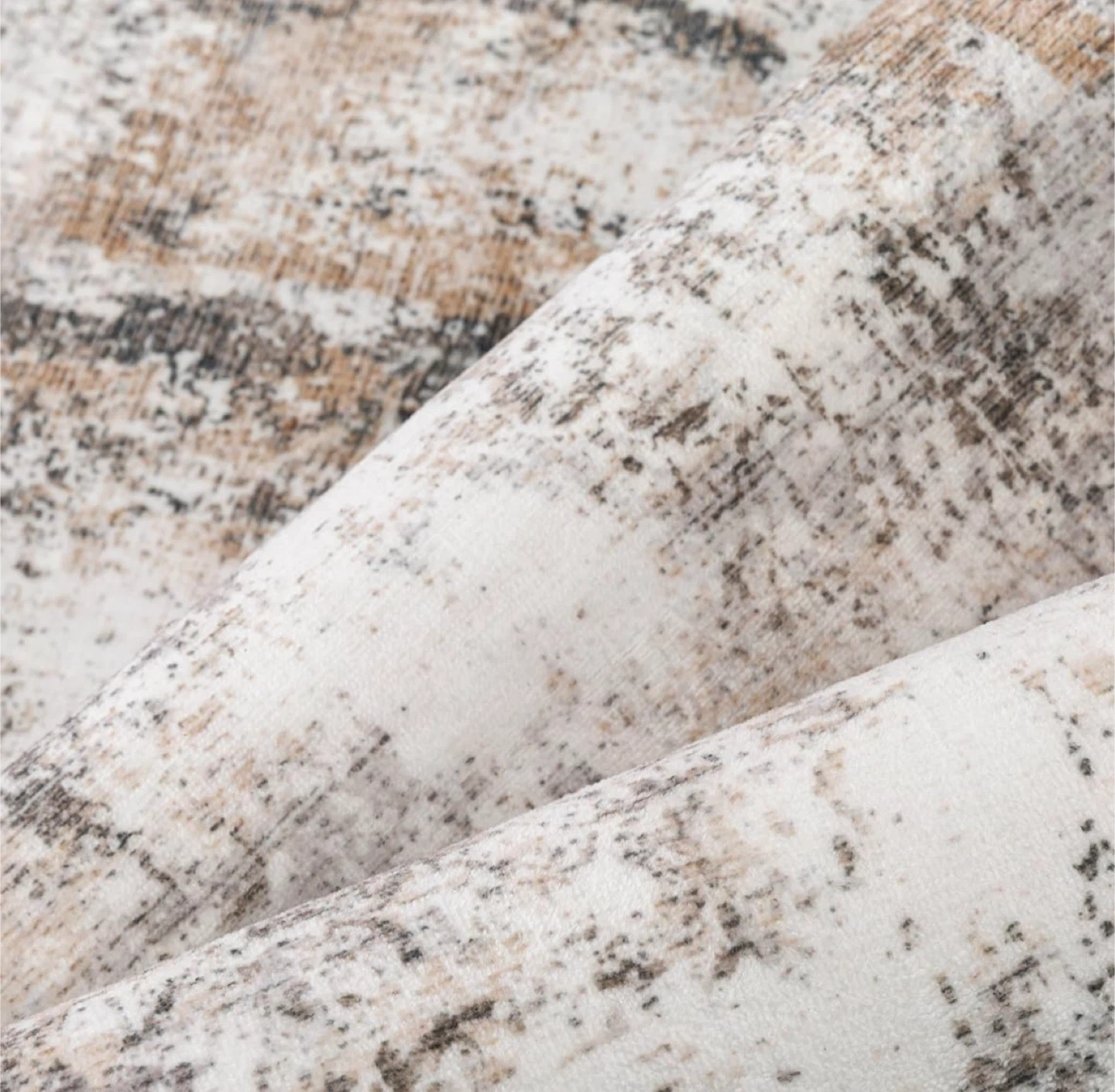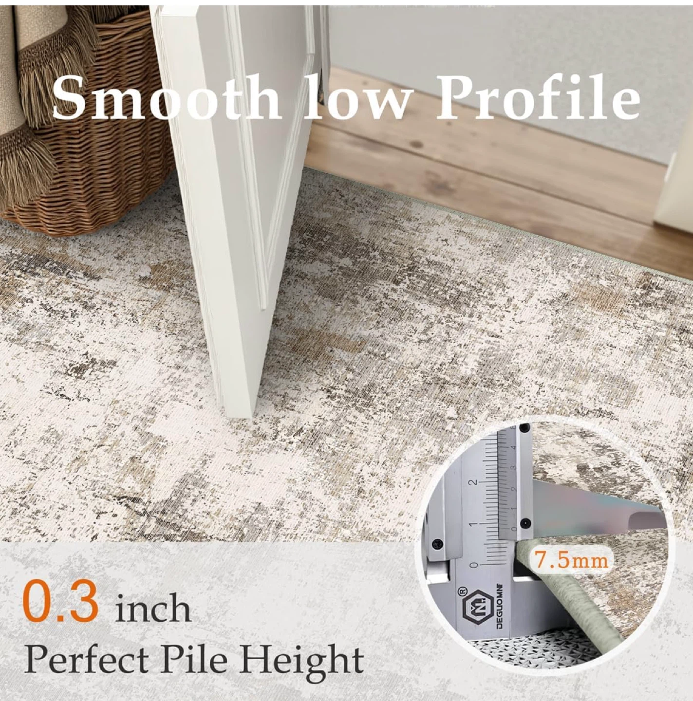 This is a distressed abstract area rug with a smooth low profile. The pile height is 0.3 inch (7.5mm).