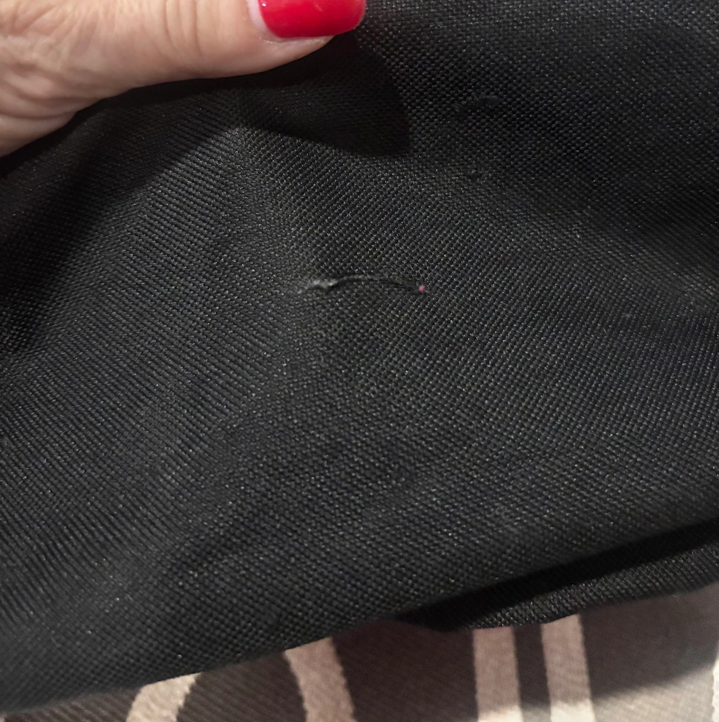 Flaw: There is a small 1-inch rip on the bottom of the bag (see close-up photo). It does not affect functionality and can be easily stitched or patched if desired.