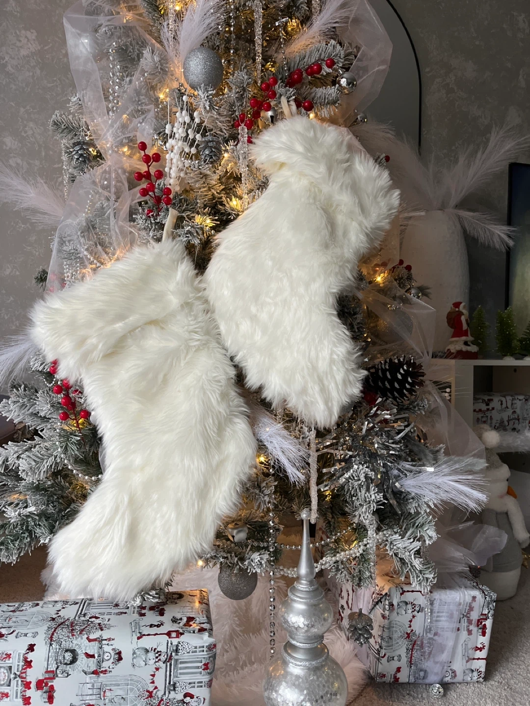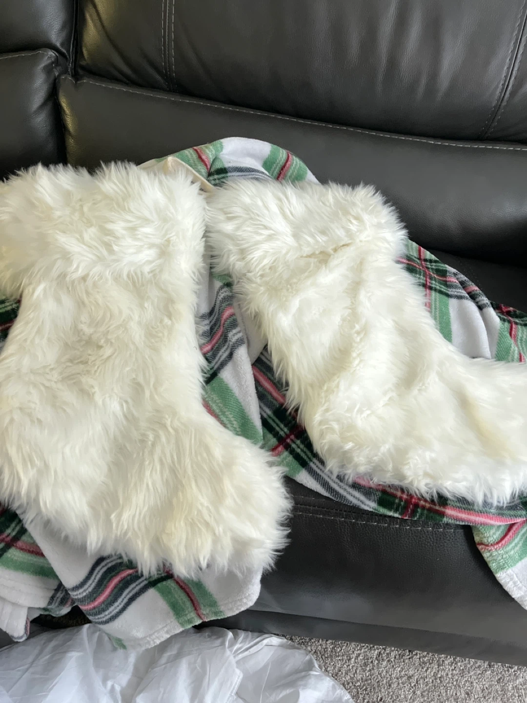 Selling two white faux fur Christmas stockings. They're perfect for adding a cozy and festive touch to your holiday decor! They are in great condition and ready to hang by the fireplace