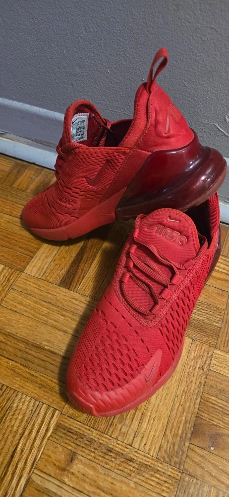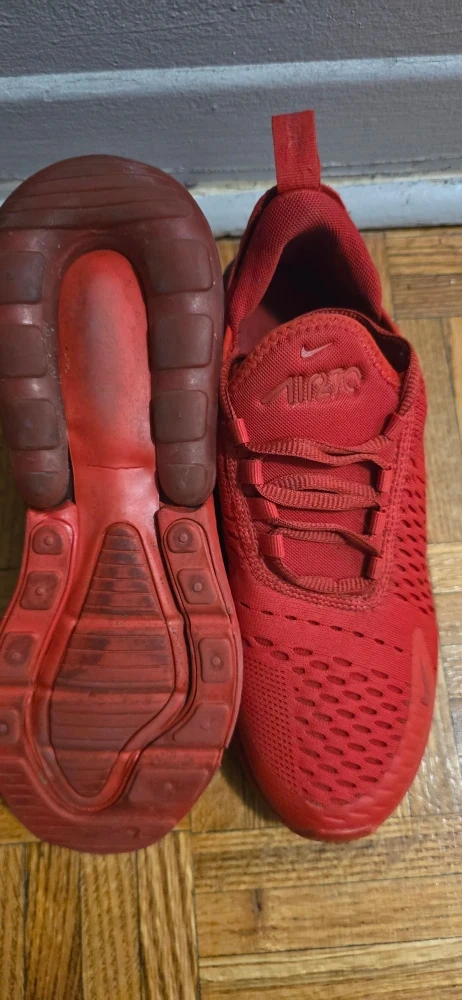 Selling a pair of red Nike Air Max 270 shoes in youth size 5.5Y. They are in used condition, as seen in the photos. Perfect for everyday wear!