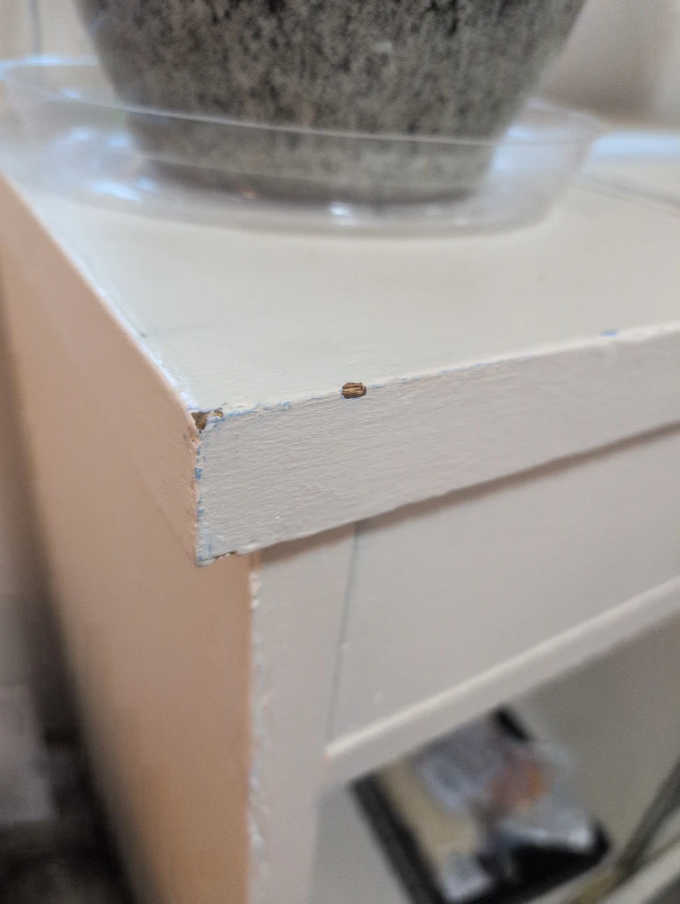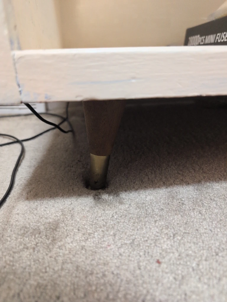 Solid wood, has some chips and scratches. Stands on legs that are wood with metal bases, legs are about 2.5inches