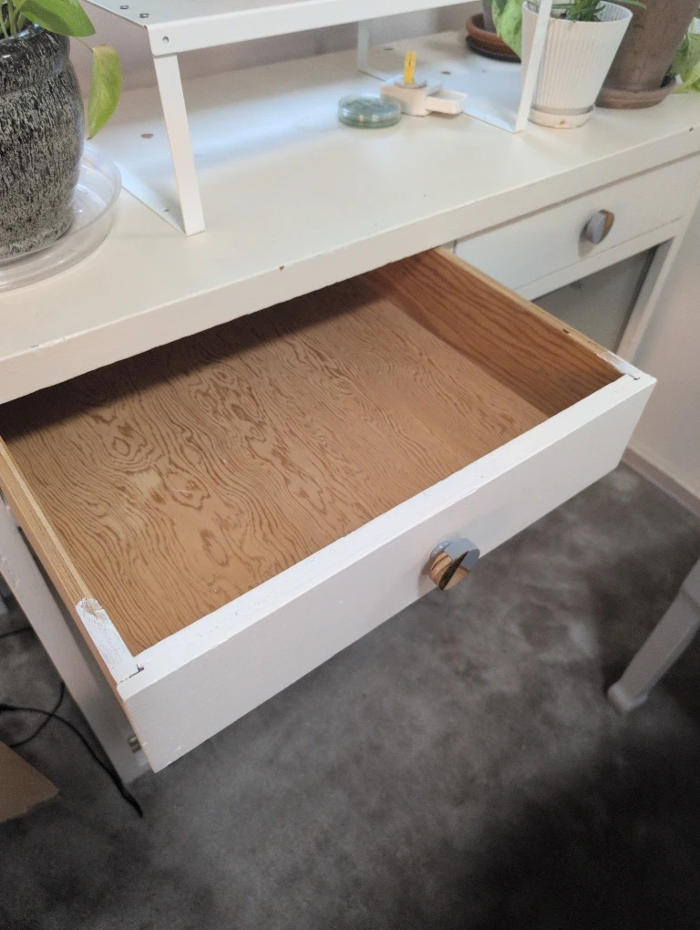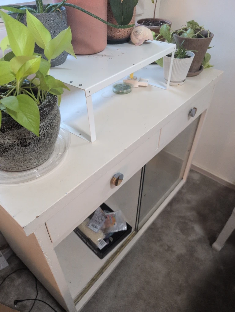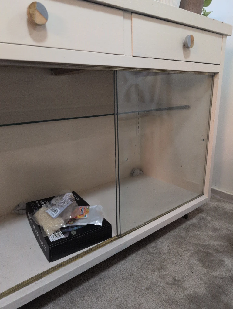 Selling a charming white cabinet! It features two drawers on top and glass doors on the bottom, perfect for displaying your favourite items or storing essentials.