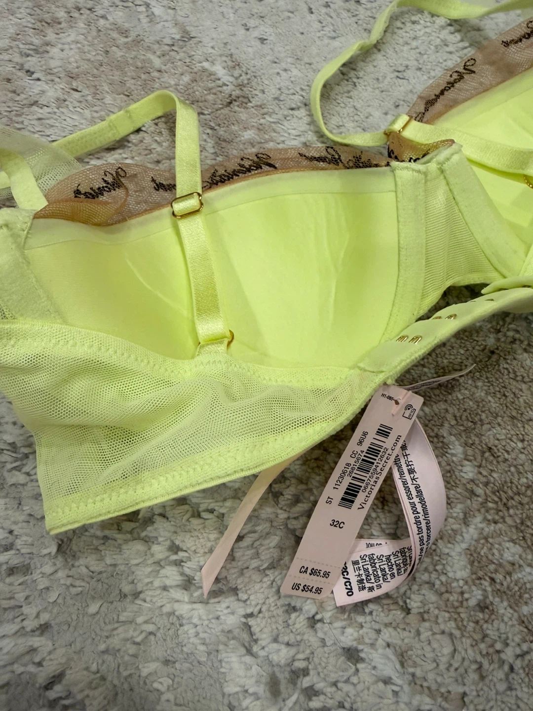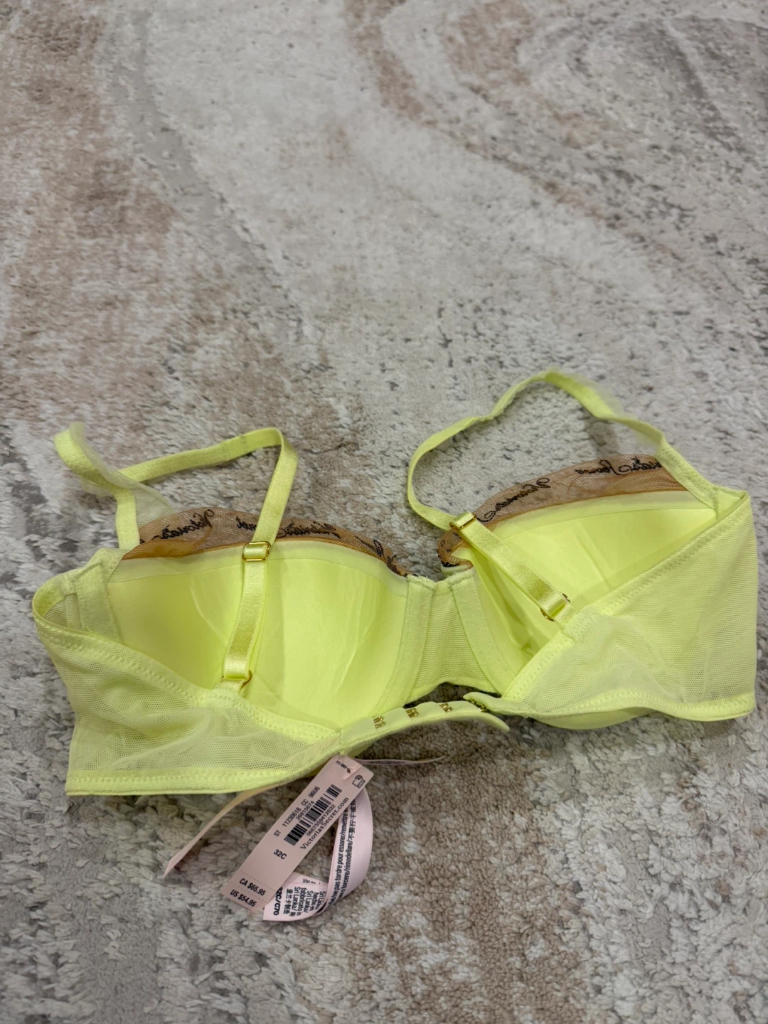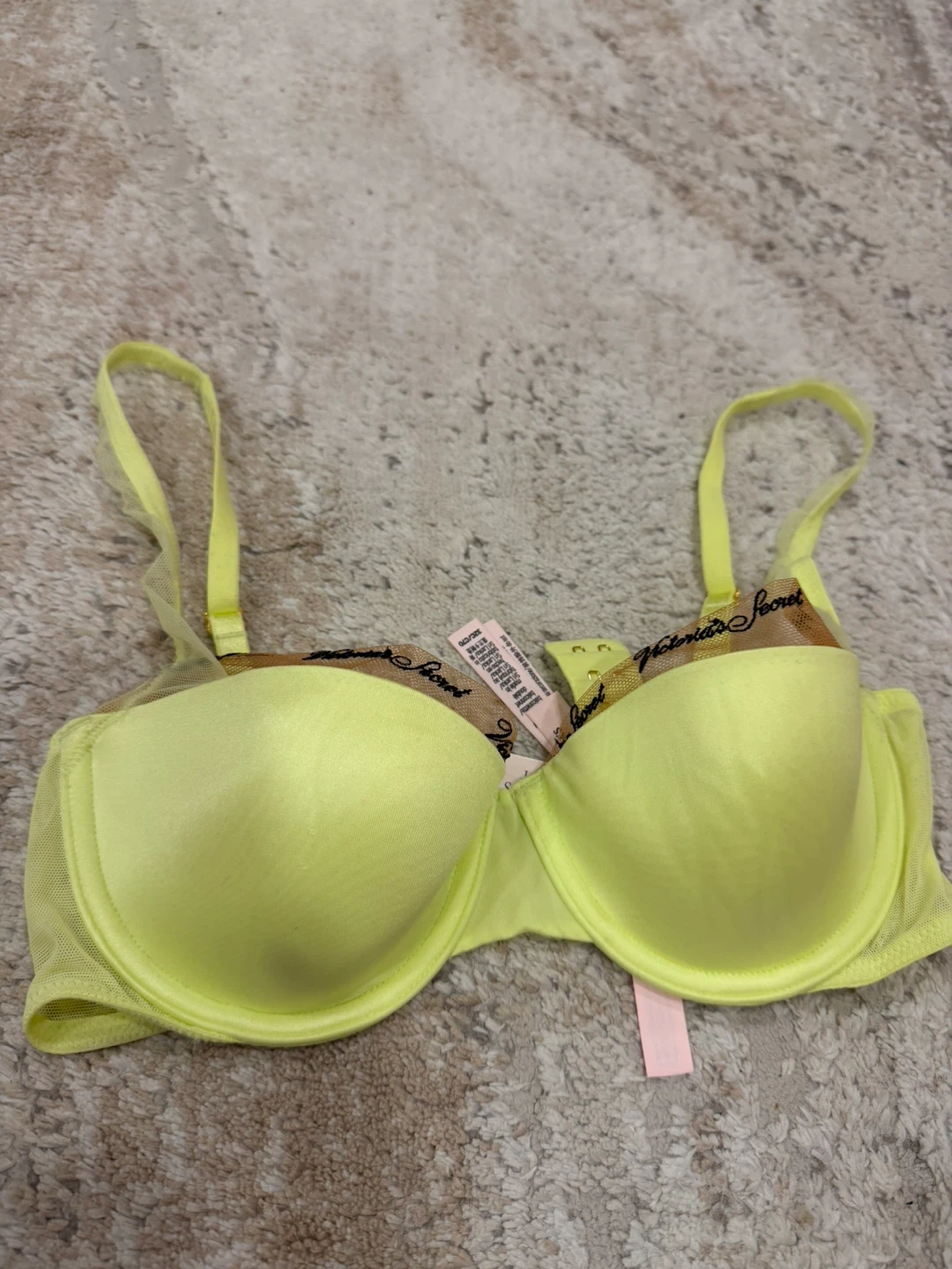 Victoria's Secret bra in size 32C and a vibrant yellow color with nude mesh and black logo! This bra is in new and ready for a new home. Originally bought for $54.95 now only $25!