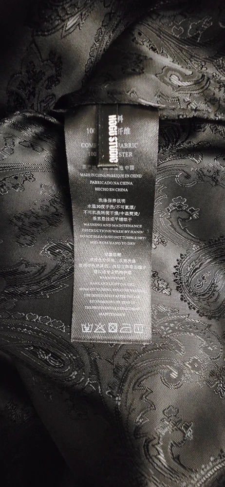 Hogu Studio patchwork jacket. It's made from 100% polyester fabric. The jacket features a variety of colourful and patterned patches. It's definitely a statement piece!