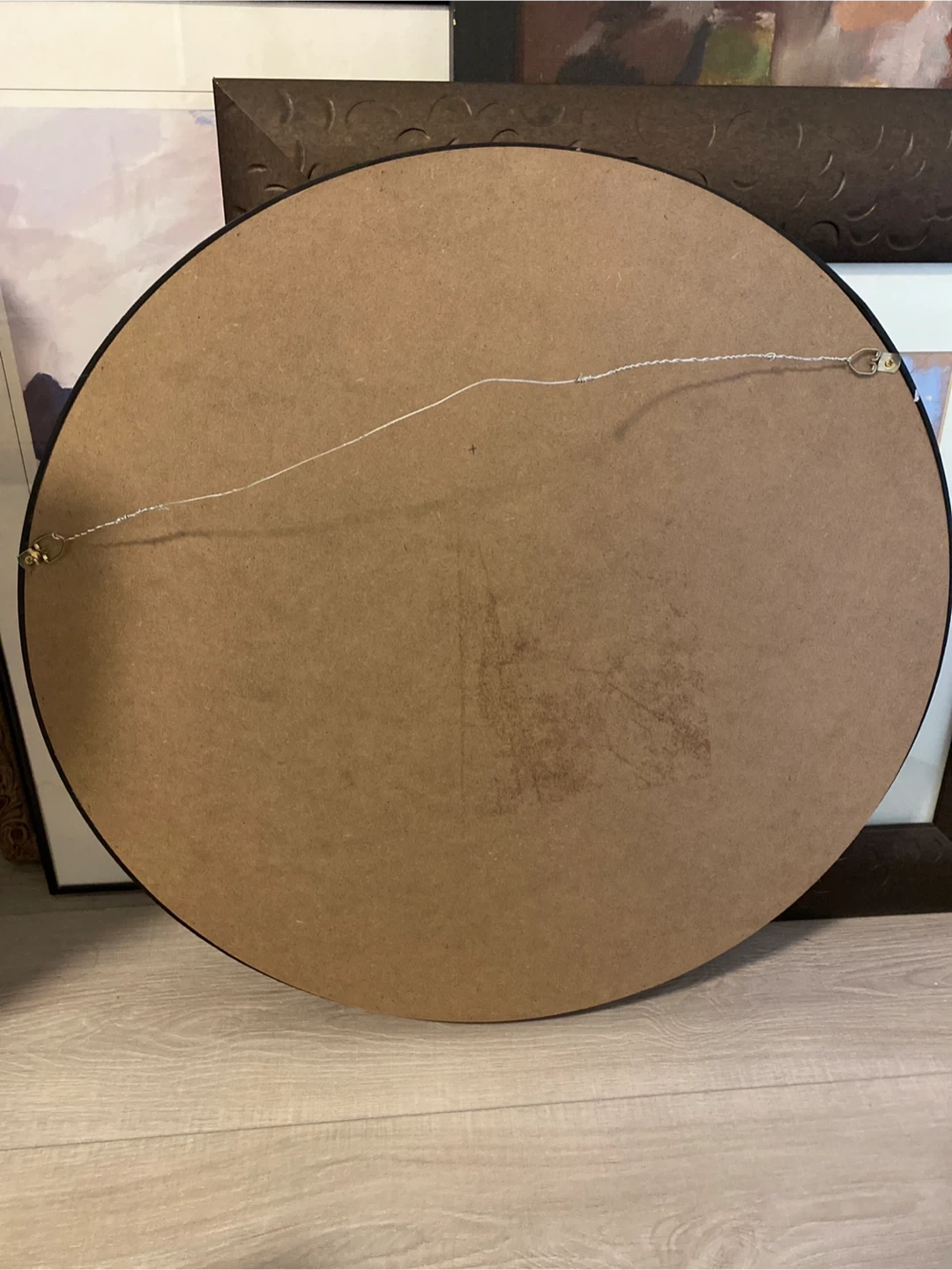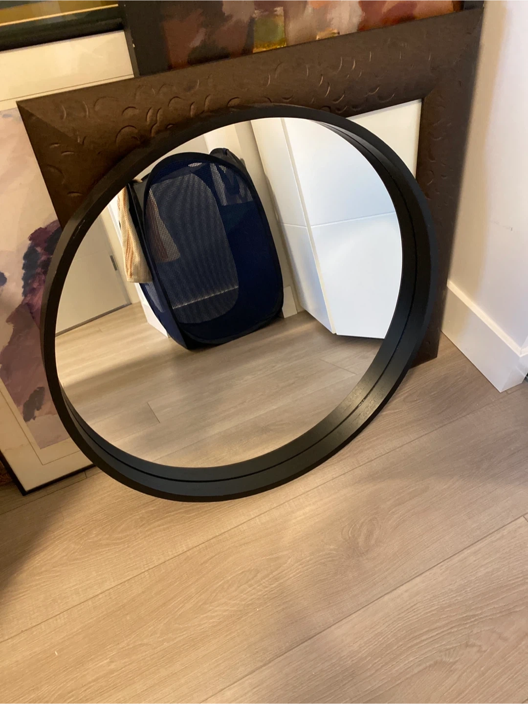 Selling a round mirror with a sleek black frame! It's in great shape and would look lovely in any room. Perfect for adding a touch of modern style to your home decor