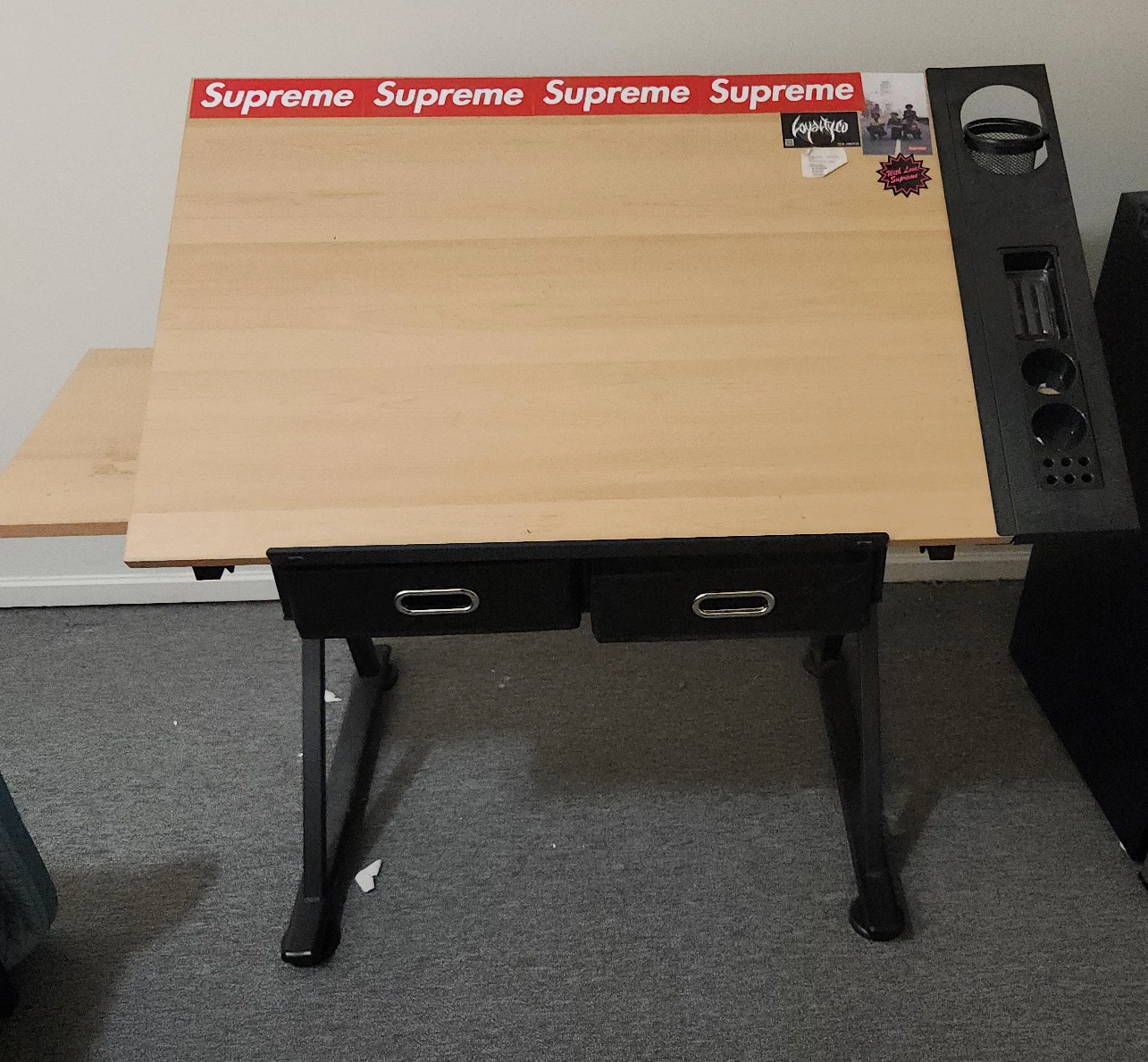 Selling a drafting table! It features a light wood-colored surface with black accents, including drawers and a side organizer. Perfect for artists or anyone needing a tilted workspace