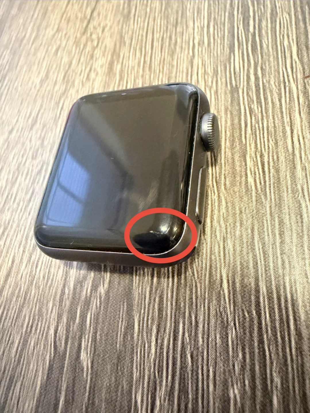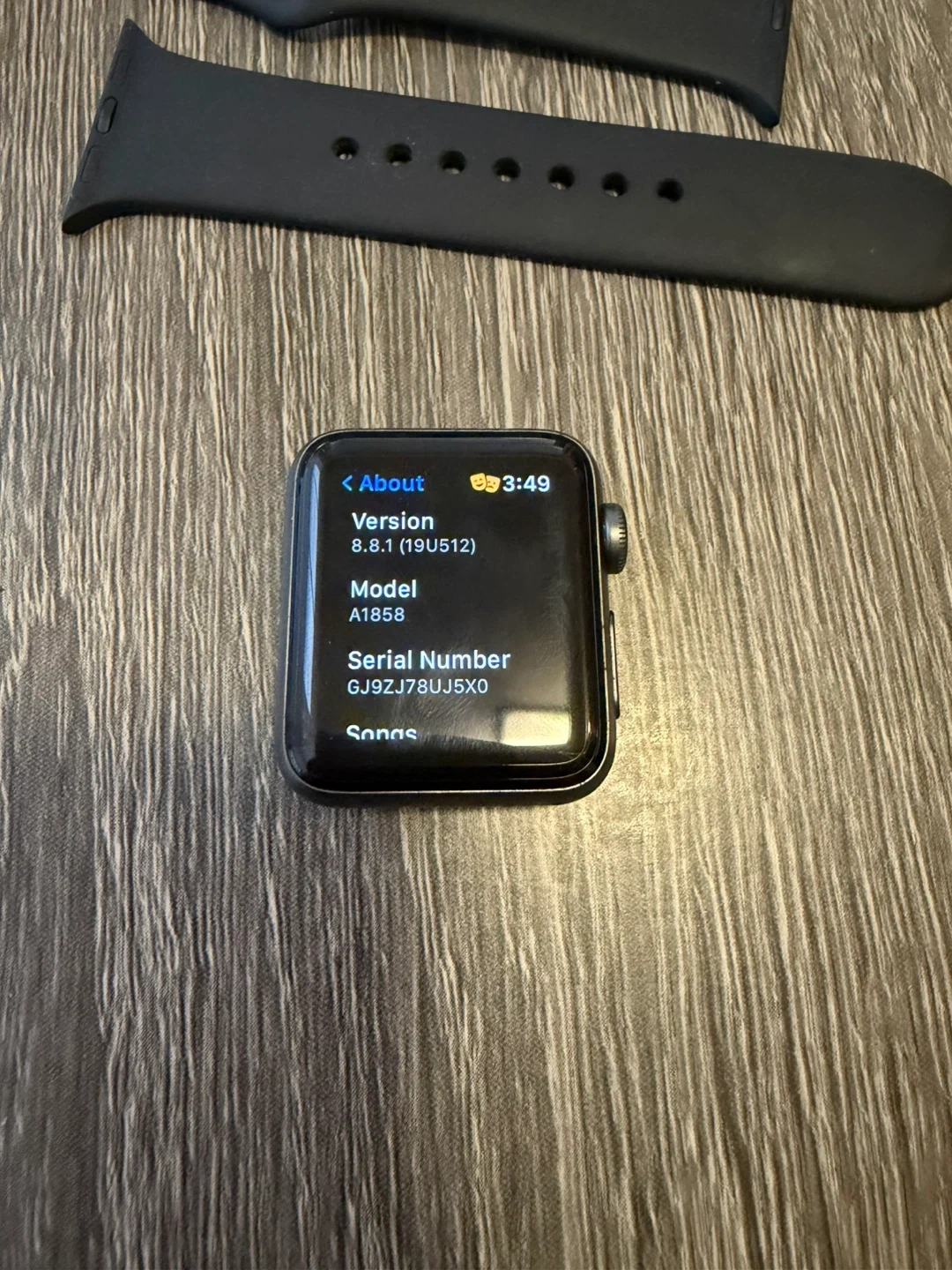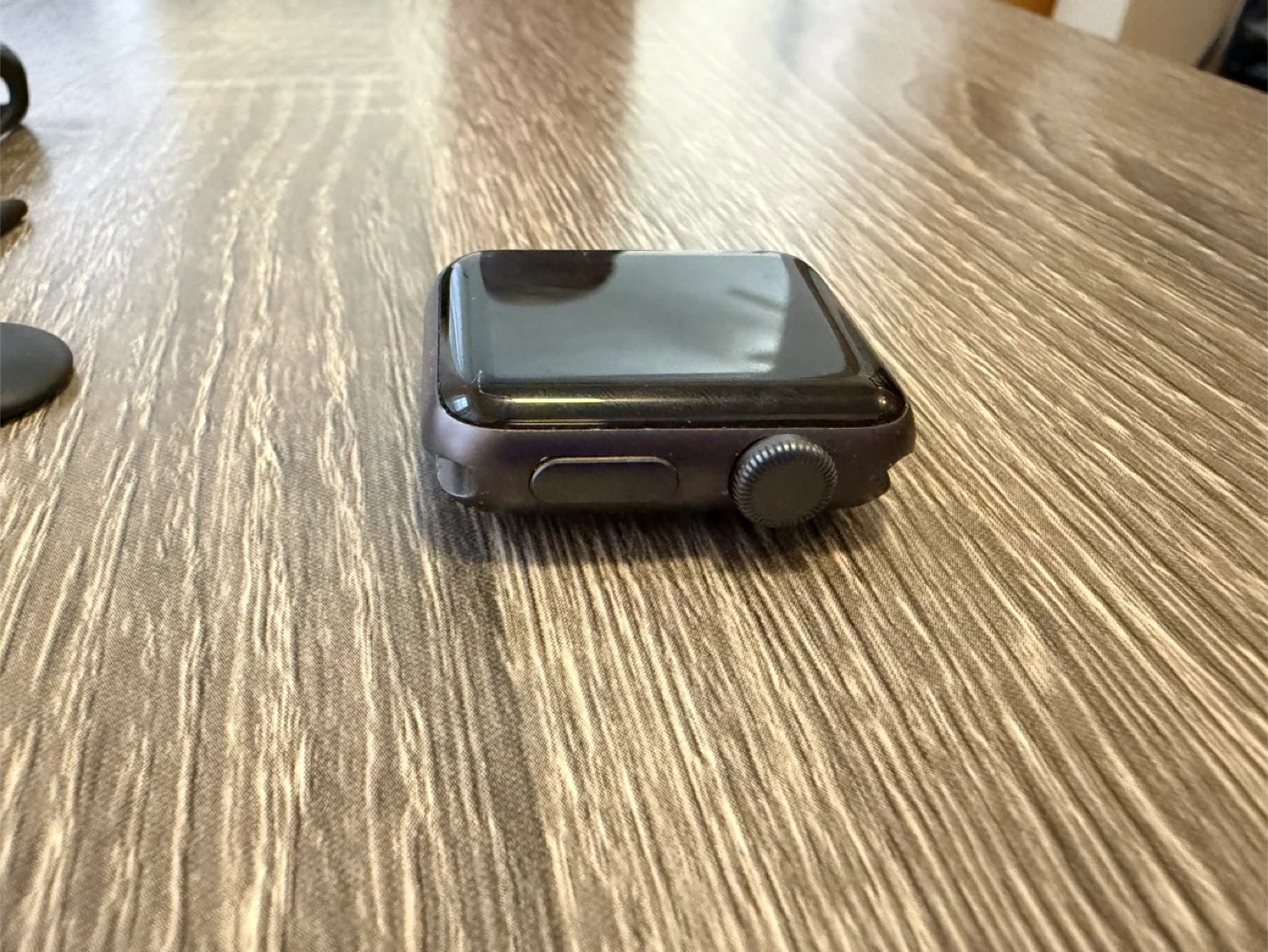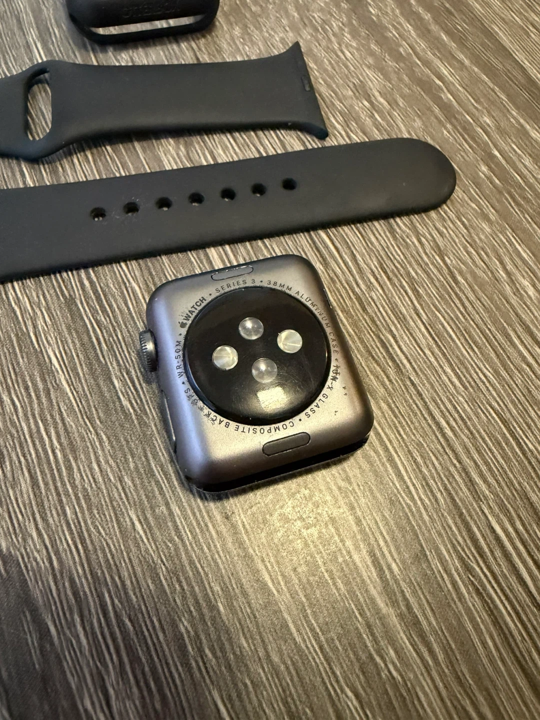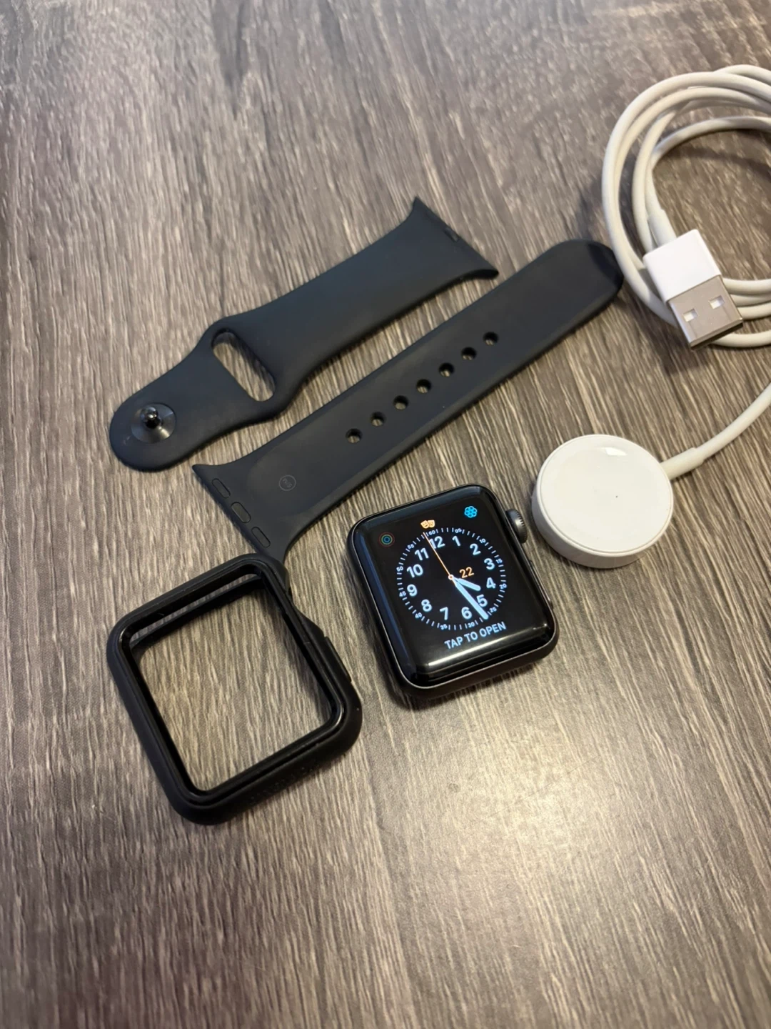 Selling an Apple Watch Series 3, model A1858. It comes with the charger, a black band, and a protective case. There's a bit of wear on the corner, as shown in the pictures, but it's in otherwise good condition!