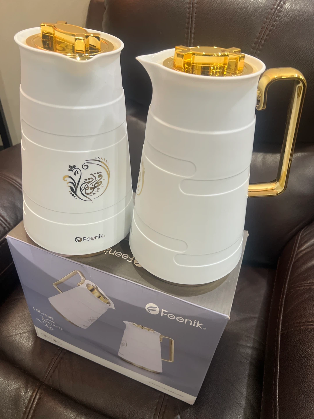 Selling a beautiful Feenik vacuum jug set. It comes with two jugs in white with gold accents. Perfect for keeping your beverages hot or cold! Box is included