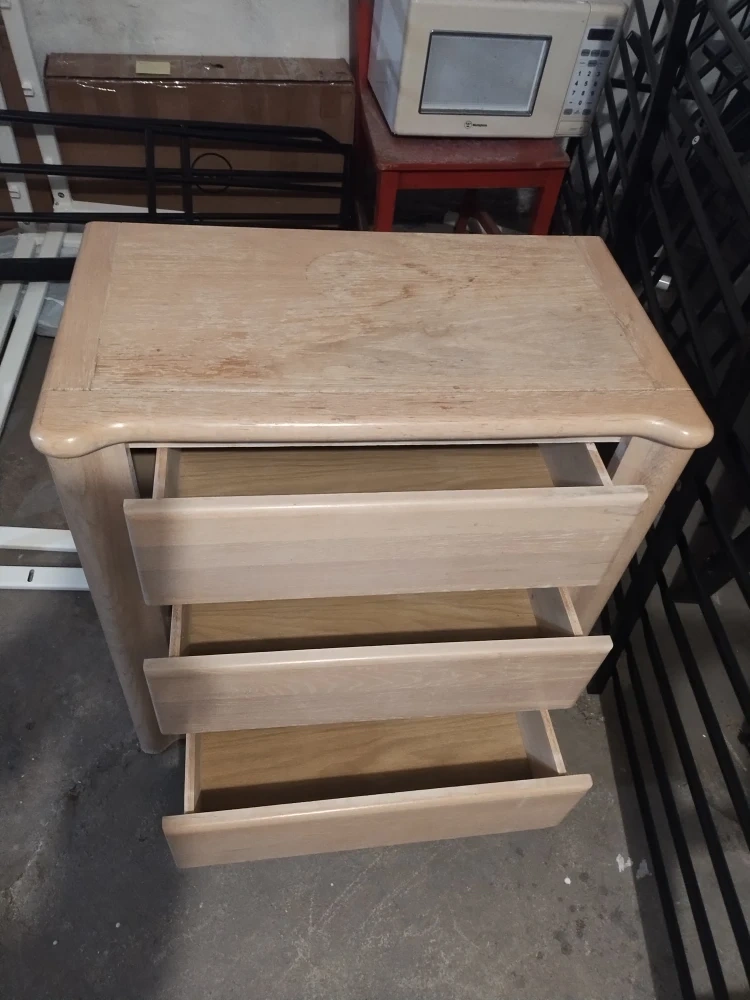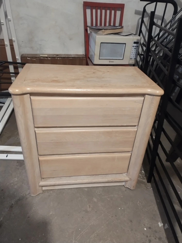 Selling a wooden dresser with three drawers. It's a great piece for adding storage to any room. The dresser is made of wood and has a light, natural finish. It's sturdy and ready for a new home!