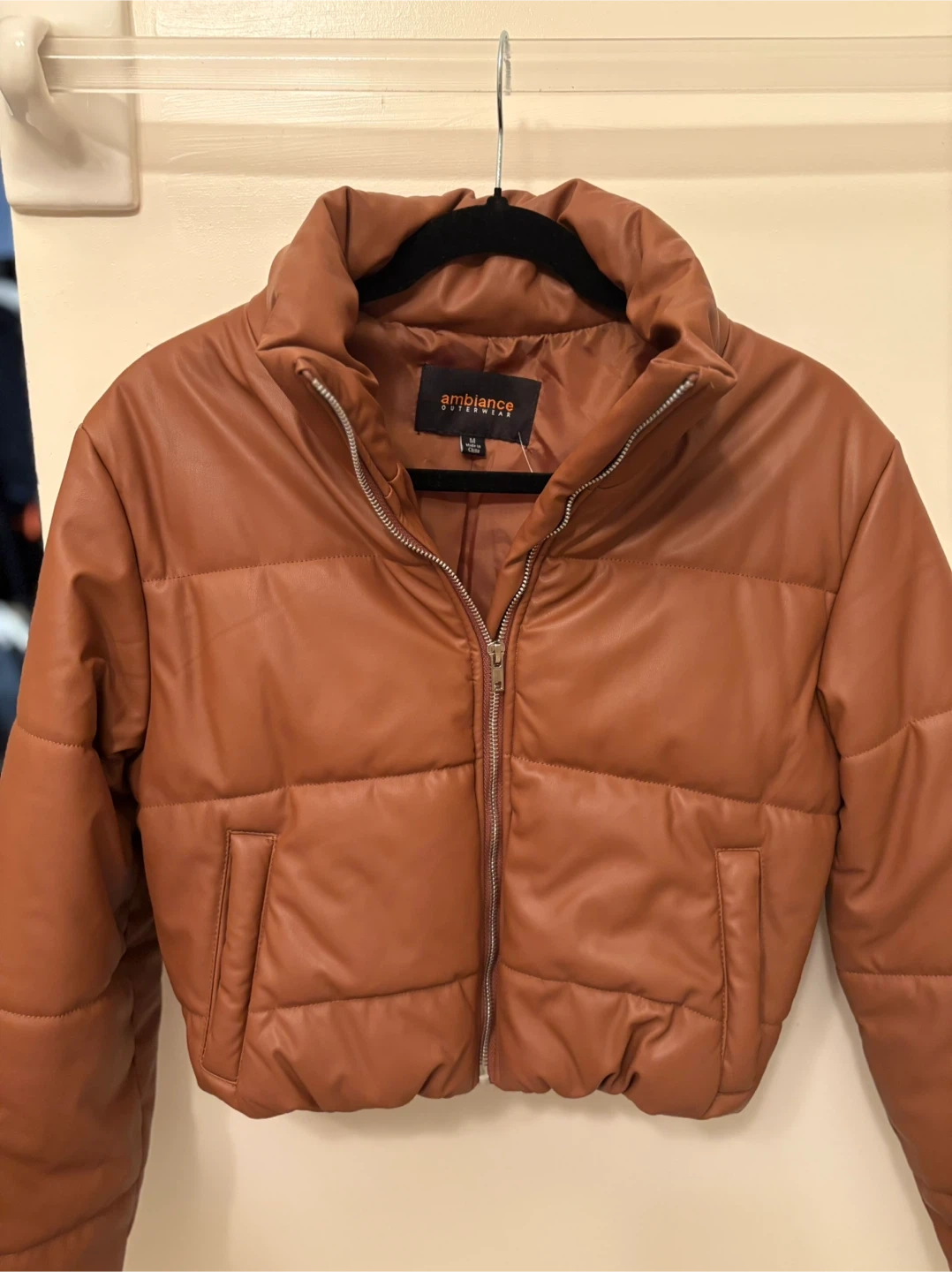 Cozy and stylish brown puffer jacket from Ambiance Apparel! It's a size medium and in great condition. Perfect for adding a bit of warmth and style to your wardrobe.