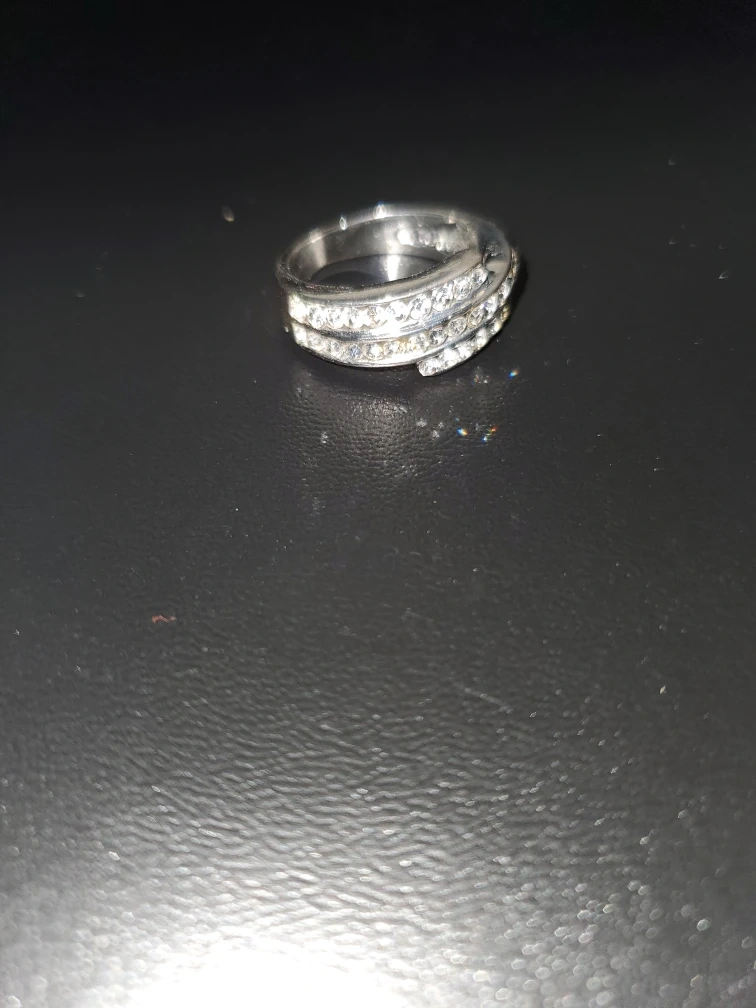Selling a silver-tone ring featuring three rows of sparkling rhinestones. It's in good condition and ready to add a bit of sparkle to your day!