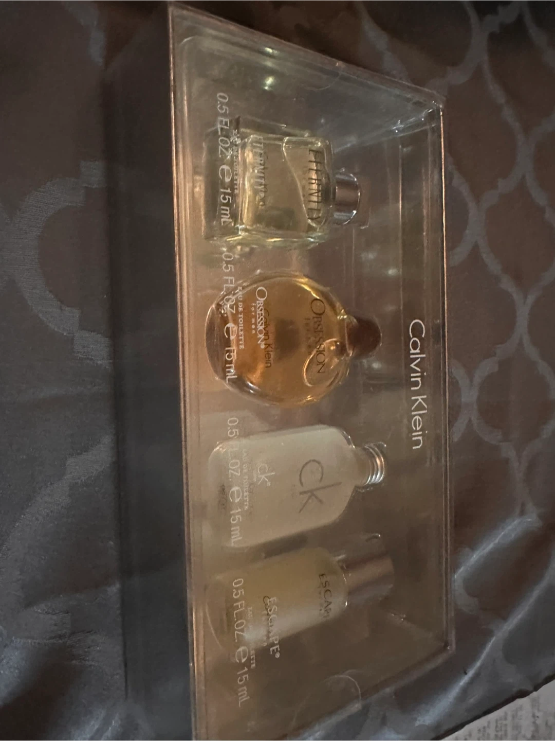 Selling a brand new Calvin Klein miniature cologne set! Includes Eternity, Obsession, CK One, and Escape fragrances. Each bottle contains 0.5 fl oz (15 ml). Comes in the original box, perfect for gifting or travel