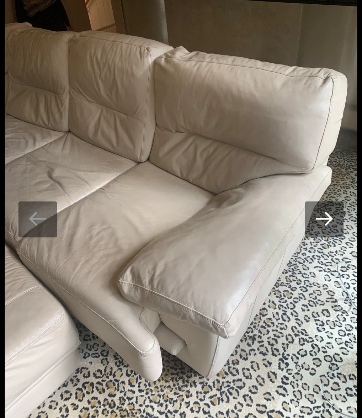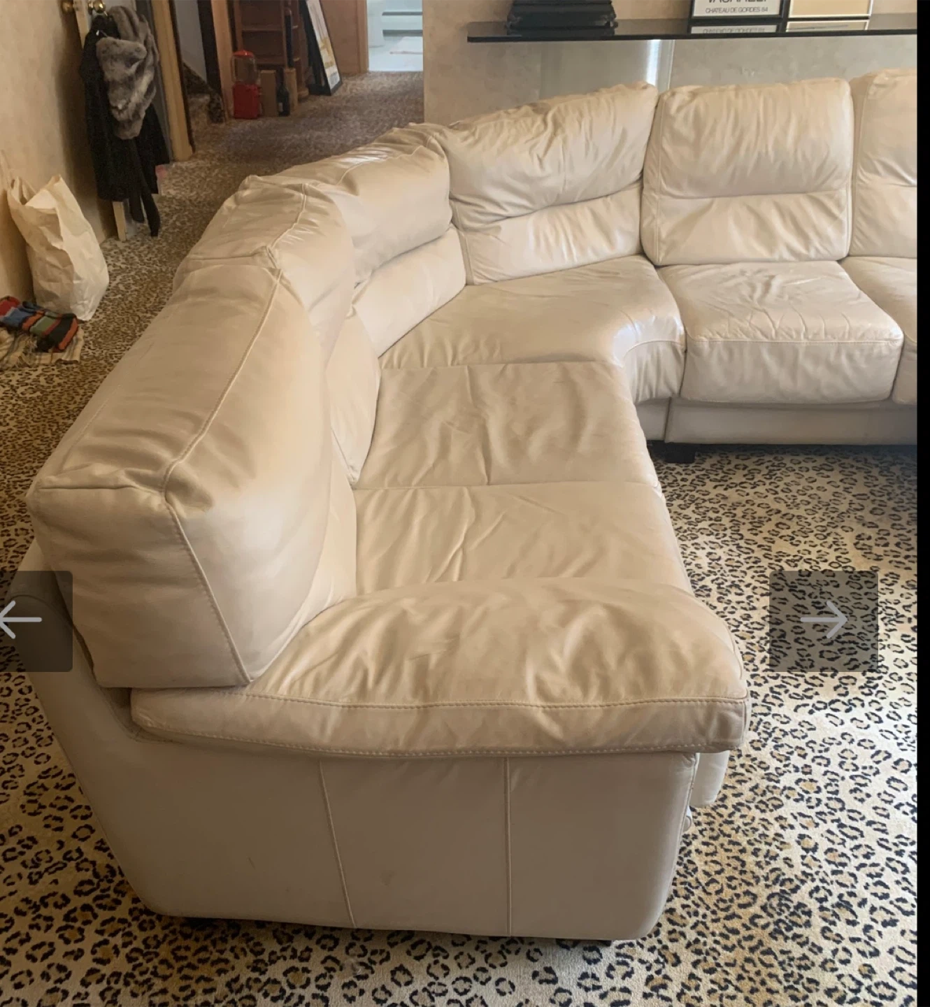 Selling a comfortable cream-colored leather sectional sofa, perfect for a living room or entertainment area! It comes with a matching ottoman for extra relaxation. The sofa shows some signs of use but is generally in good condition and ready for a new home
