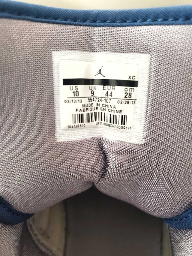 Stylish Air Jordan sneakers in blue and white with red accents from 2013. Features iconic logo and comfortable design. Men's size 10 Colours: white, fire red, true blue, cement grey Condition: pre-loved, in good, gently used condition. Slight creases visible on top of sneakers. Clean, smoke free home. Please look at pictures carefully for details. Thanks for visiting.