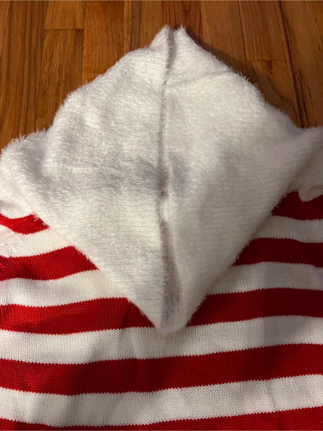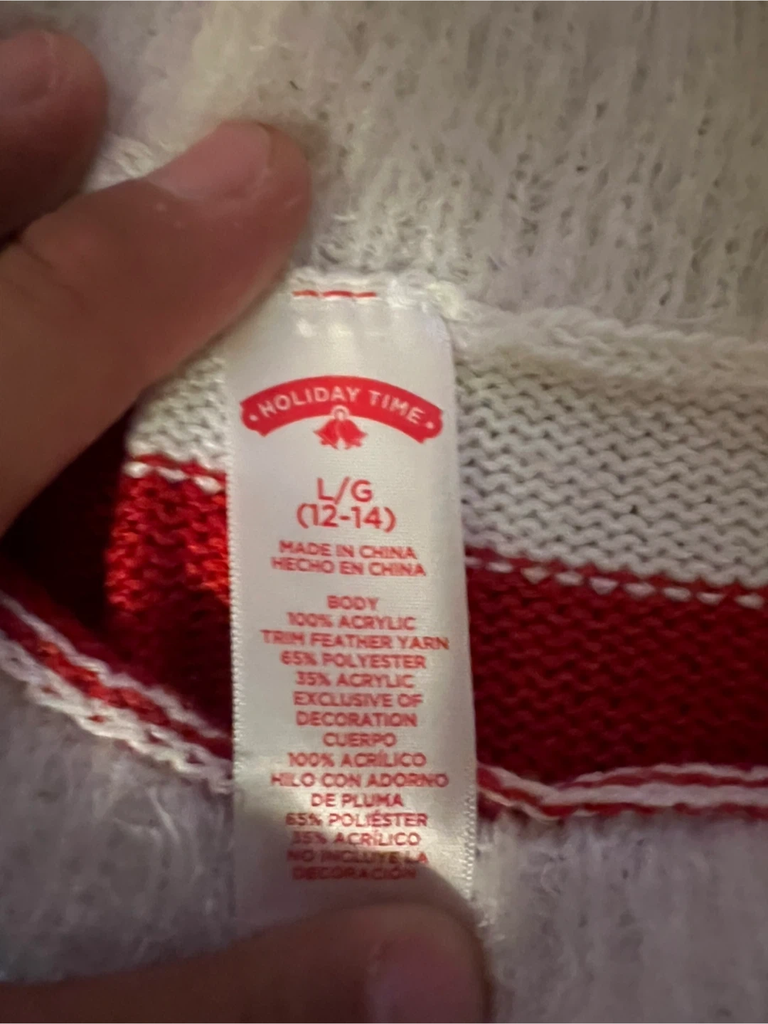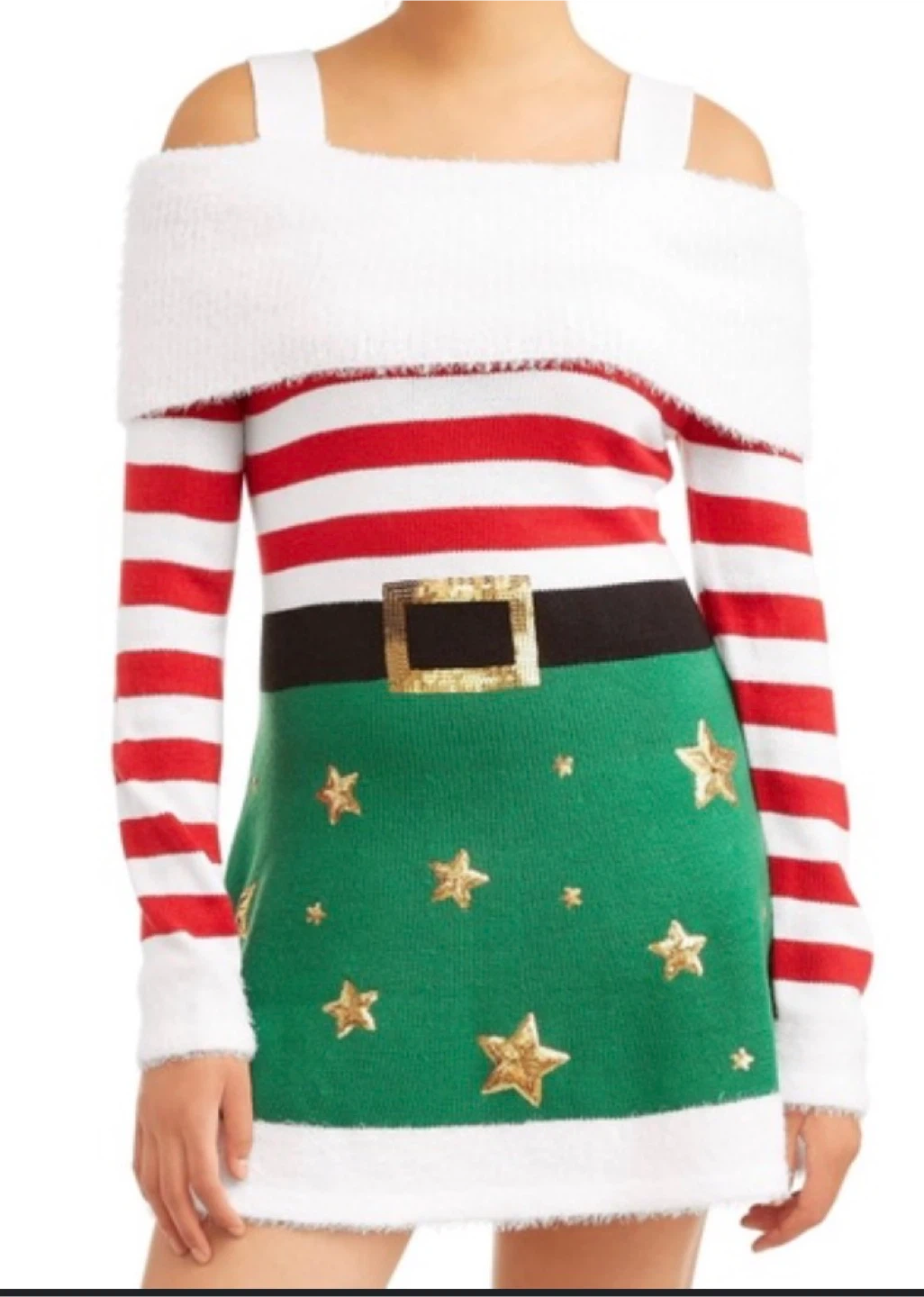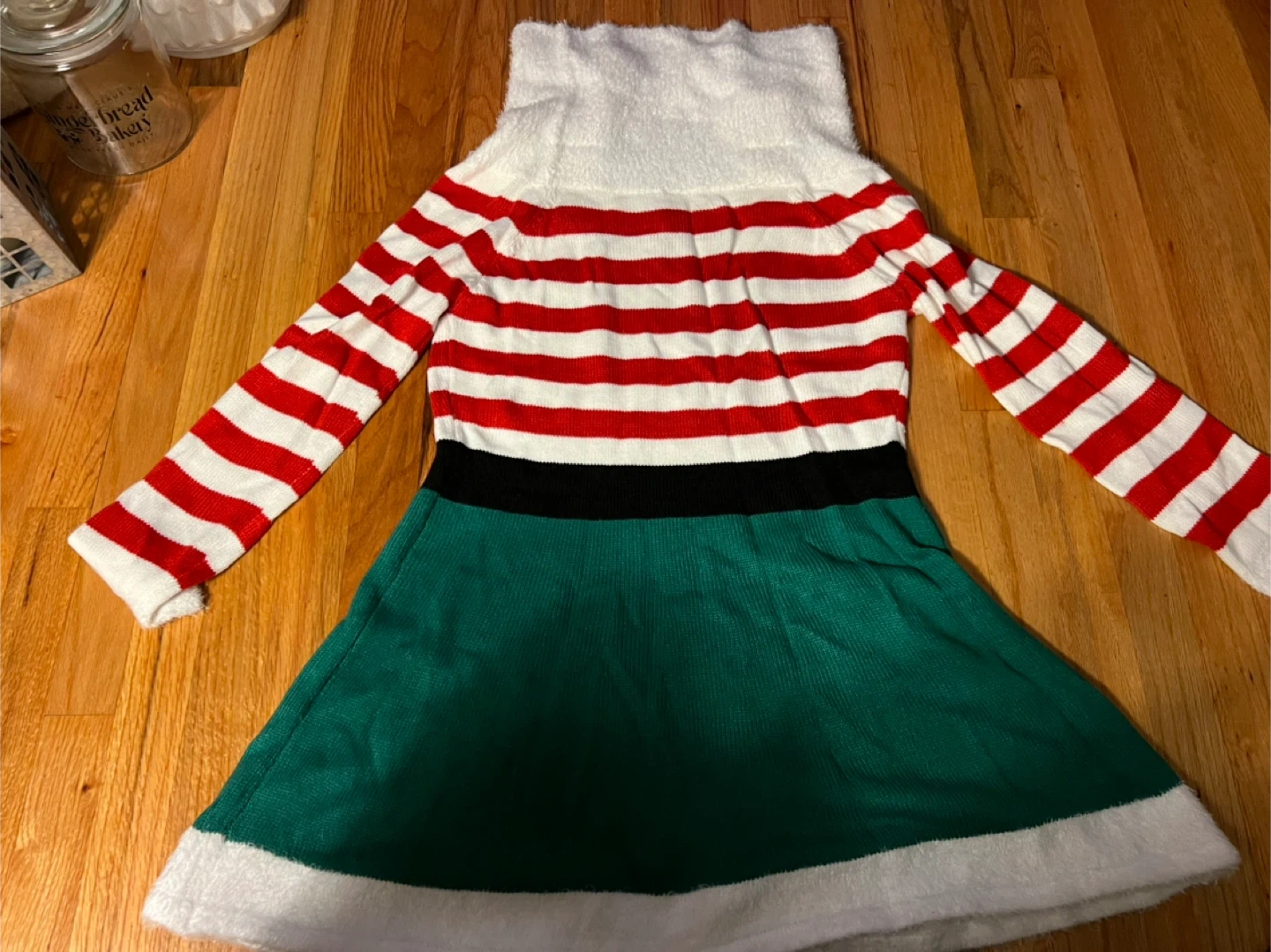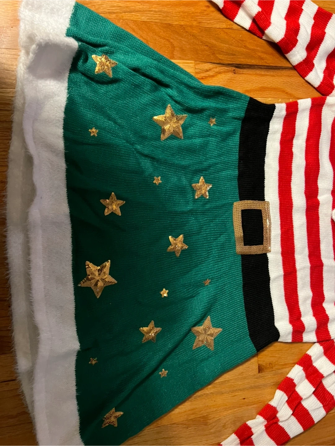 Selling a Holiday Time elf dress in size L (12-14)! It's made of 100% acrylic body with 65% polyester and 35% acrylic trim. It features a cute elf design with red and white stripes, a green skirt with gold stars, and a white faux fur trim. Perfect for the holidays!