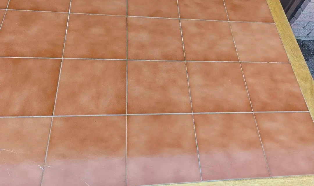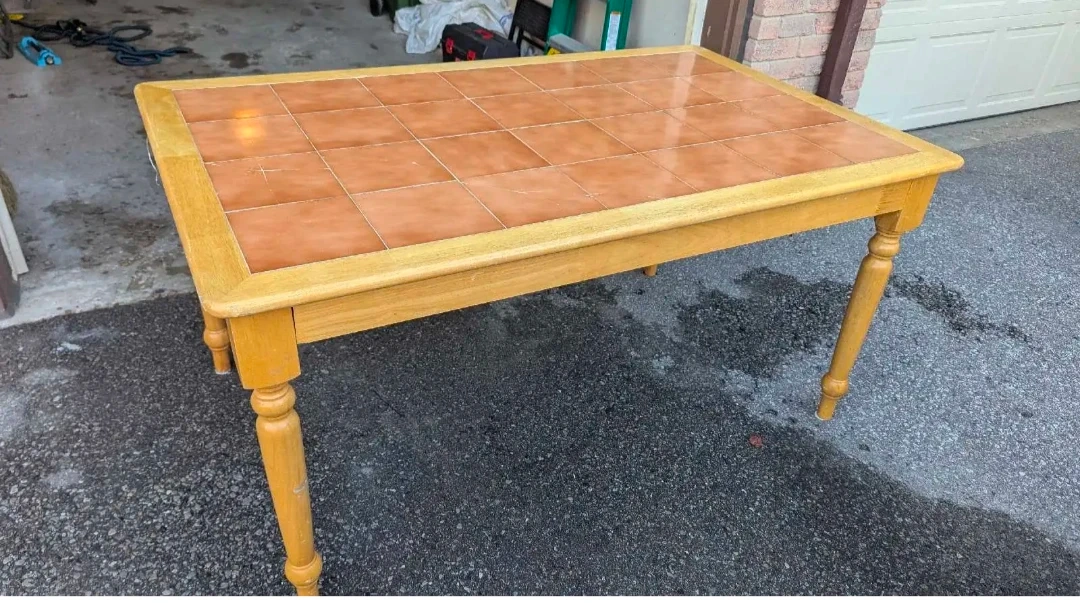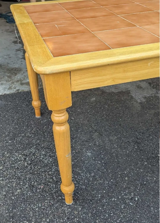 Selling a dining table with a unique tile top. It has a light wood frame and a tiled surface. There are couple small cracks on the tiles on the one side as shown, but does not affect the function.