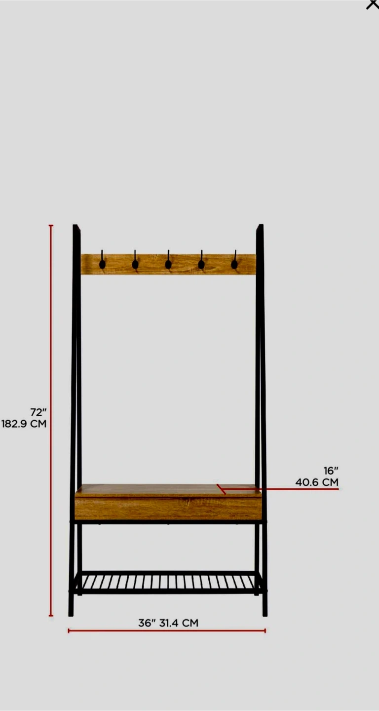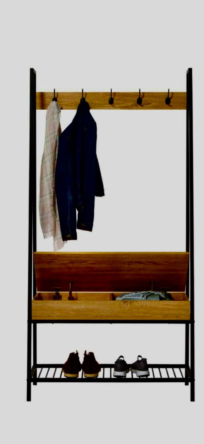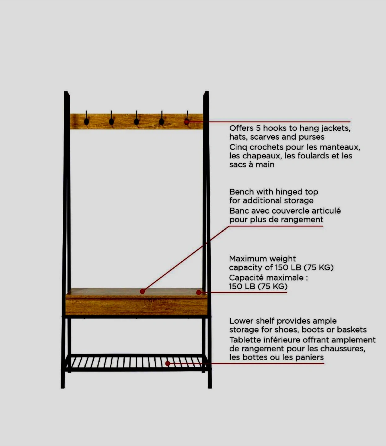 This hall tree is perfect for keeping your entryway organized! It features 5 hooks for hanging jackets, baseball or other types of hats, scarves, and purses. The bench has a hinged top for extra storage, and the lower shelf provides space for shoes, boots, or baskets. It can hold a maximum weight of 150 lb (75 kg).