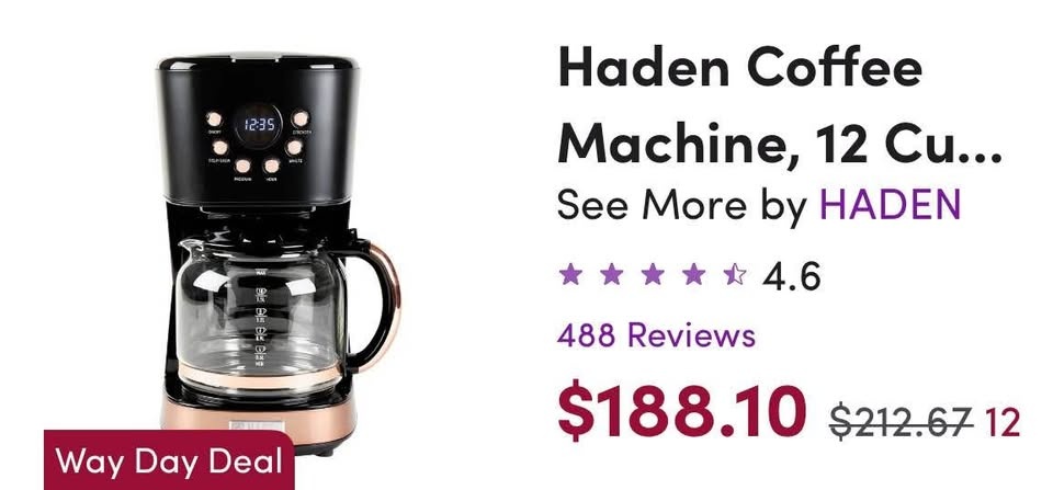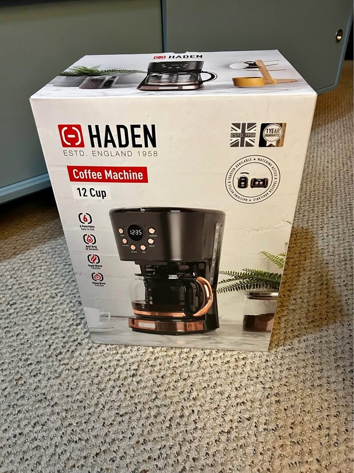 Some details from their site: This coffee maker has six functions including on/off, delay brew, program, hour, minute, and strength. It also has an LCD and a thirty-second anti-drip feature. The 1.5 litre/12 cup glass carafe and funnel are also dishwasher safe for added convenience. This coffee maker also has a keep-warm feature, so if one cup isn't enough you can simply pop back and pour yourself another cup!