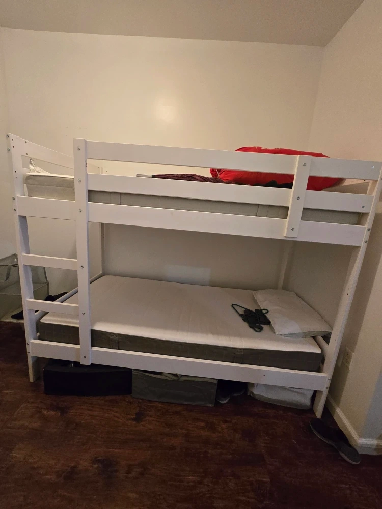 Selling a bunk bed frame in good condition! It's a sturdy, white wooden frame that's perfect for kids' rooms or guest rooms. It can save a lot of space