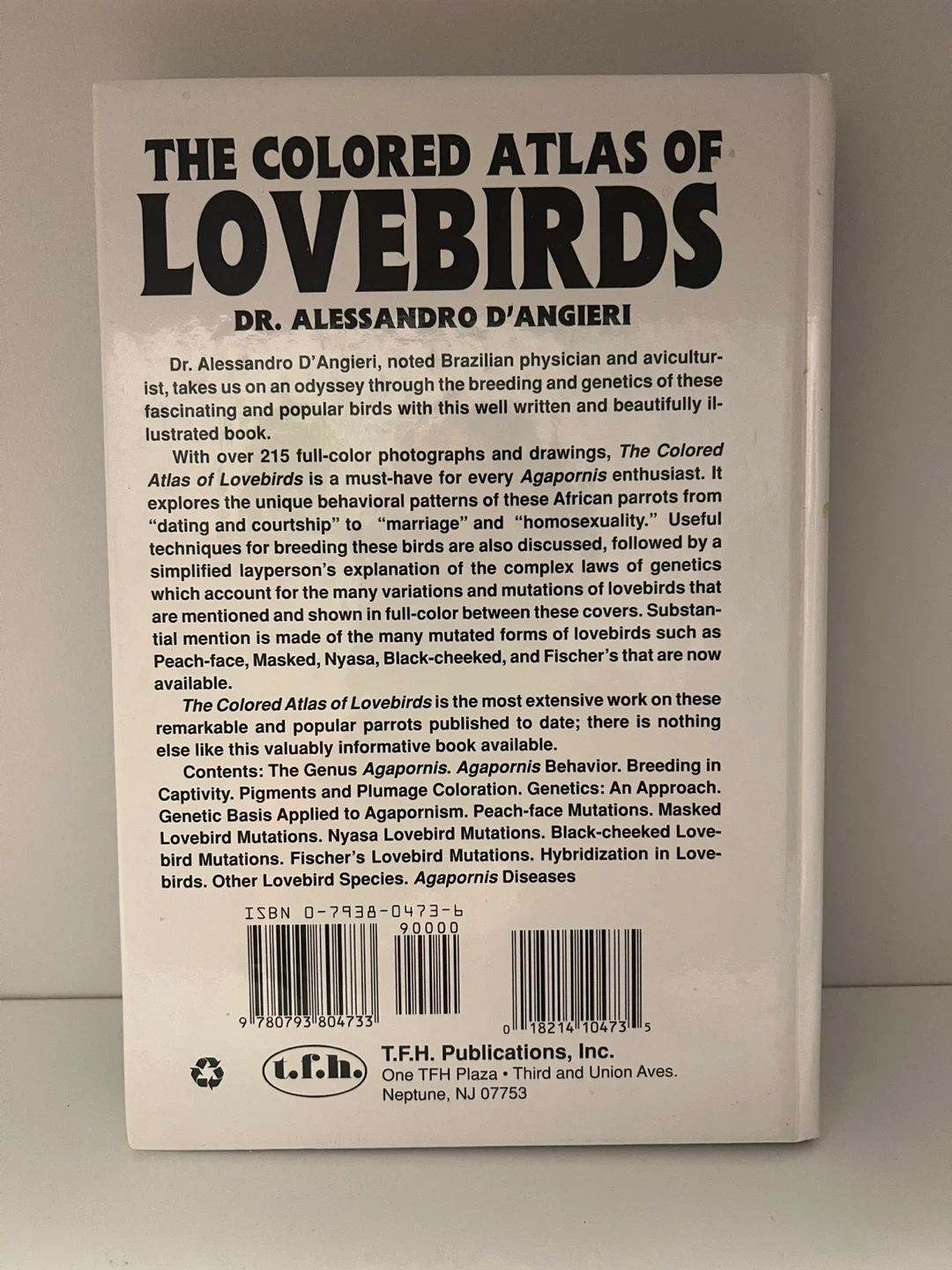Selling 'The Colored Atlas of Lovebirds' by Dr. Alessandro D'Angieri. It's a fascinating book with full-colour photographs and drawings about the breeding and genetics of lovebirds. A must-have for any lovebird enthusiast!