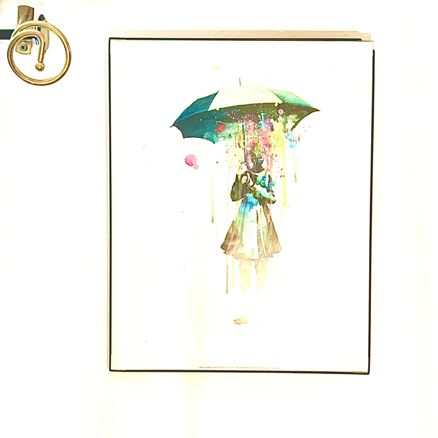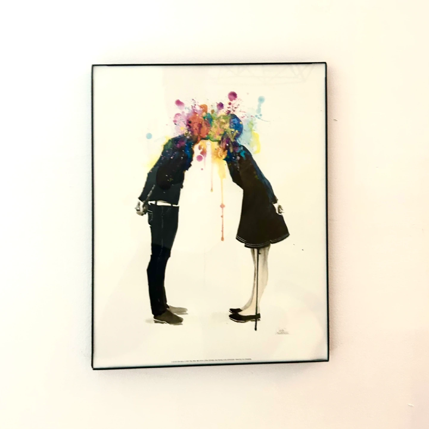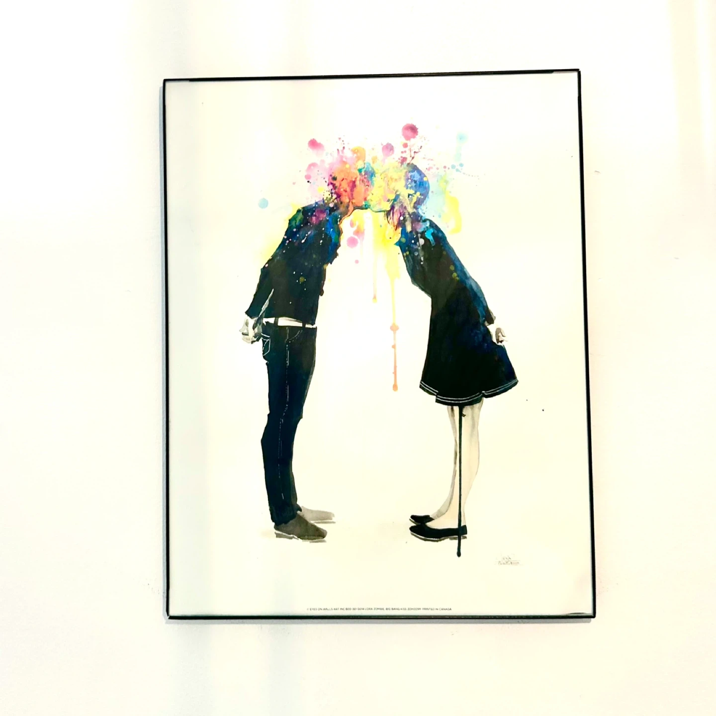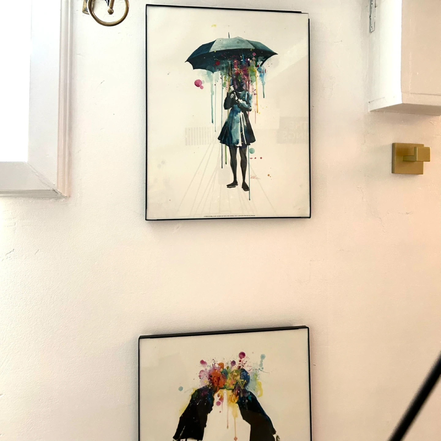 Take all for listed price! Must go! Selling some wall art! One is a picture of two people kissing with colourful paint splatters, another is a person holding an umbrella with colourful paint. The last one says "Enjoy the Little Things" in gold lettering on a black background