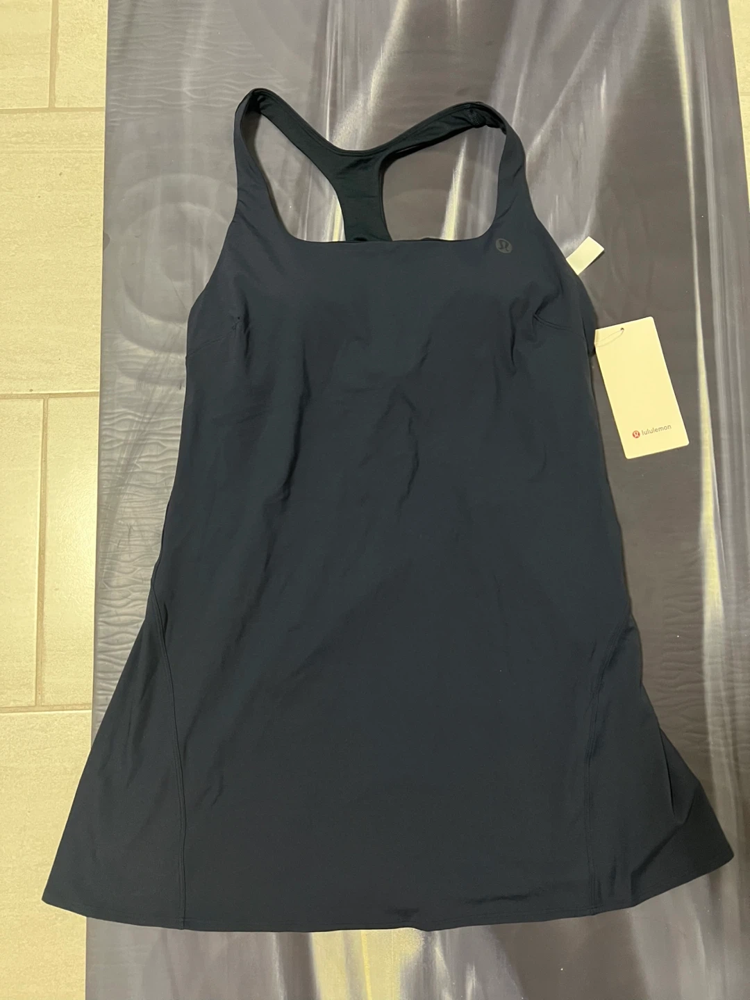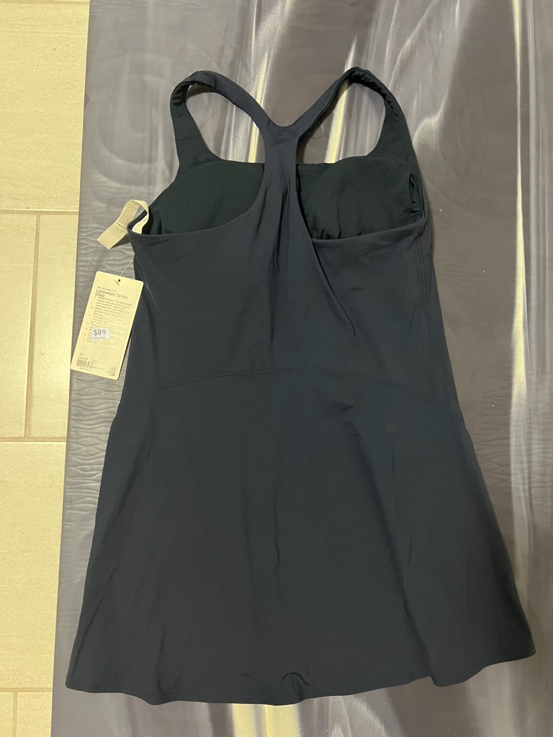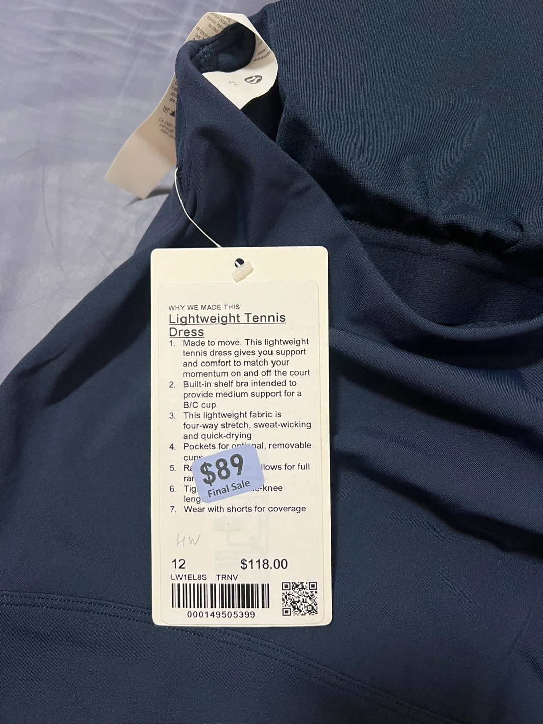 Selling a Lululemon Lightweight Tennis Dress in size 12! This dress is designed to move with you, offering support and comfort for your tennis game. It features a built-in shelf bra for medium support and four-way stretch, sweat-wicking fabric for quick drying. It also has pockets for optional, removable cups.