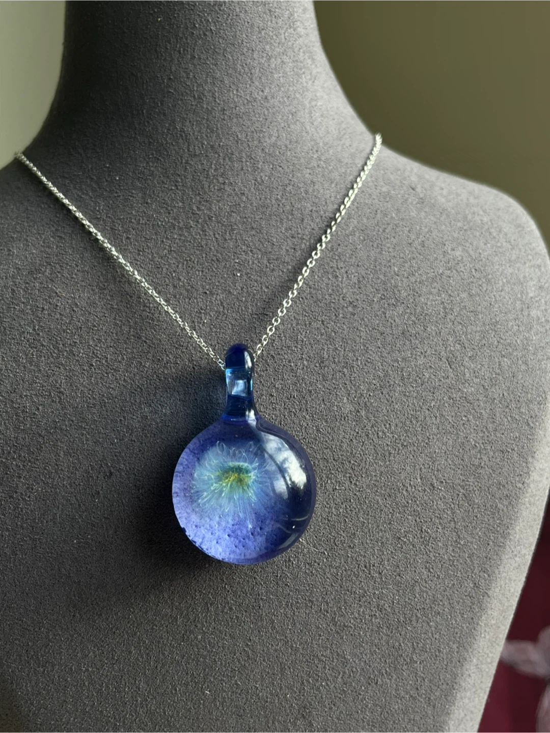 Beautiful blue glass pendant necklace with a delicate floral design inside. The pendant is a lovely shade of blue and hangs from a silver chain. It's in great condition and would make a wonderful addition to any jewelry collection