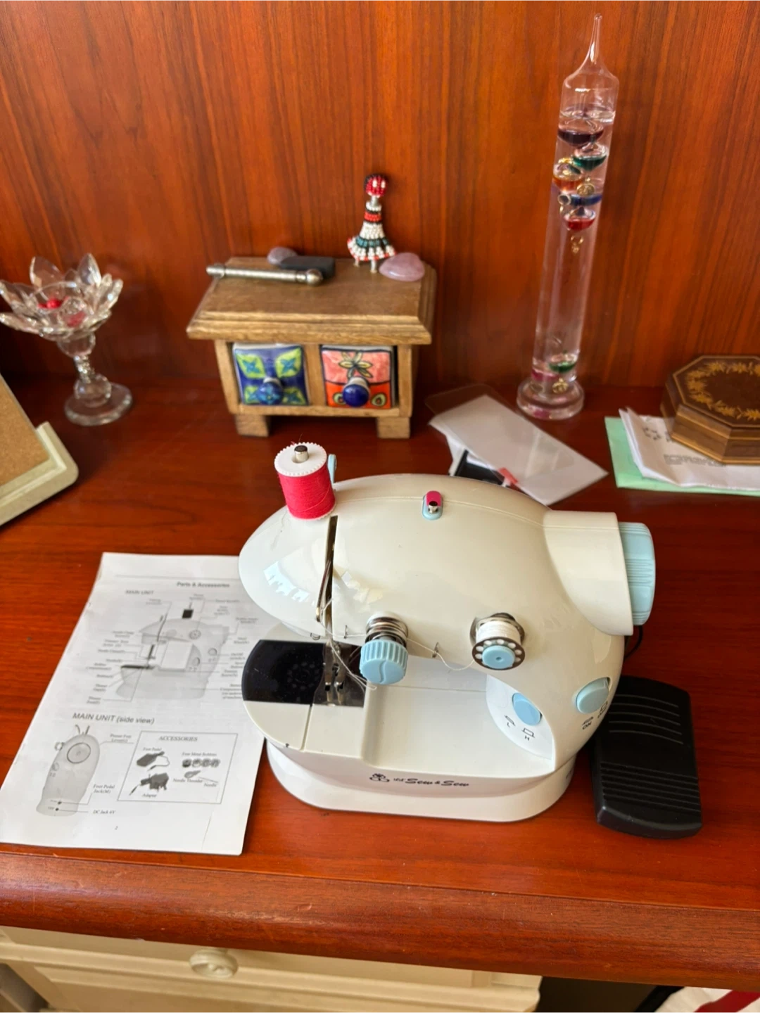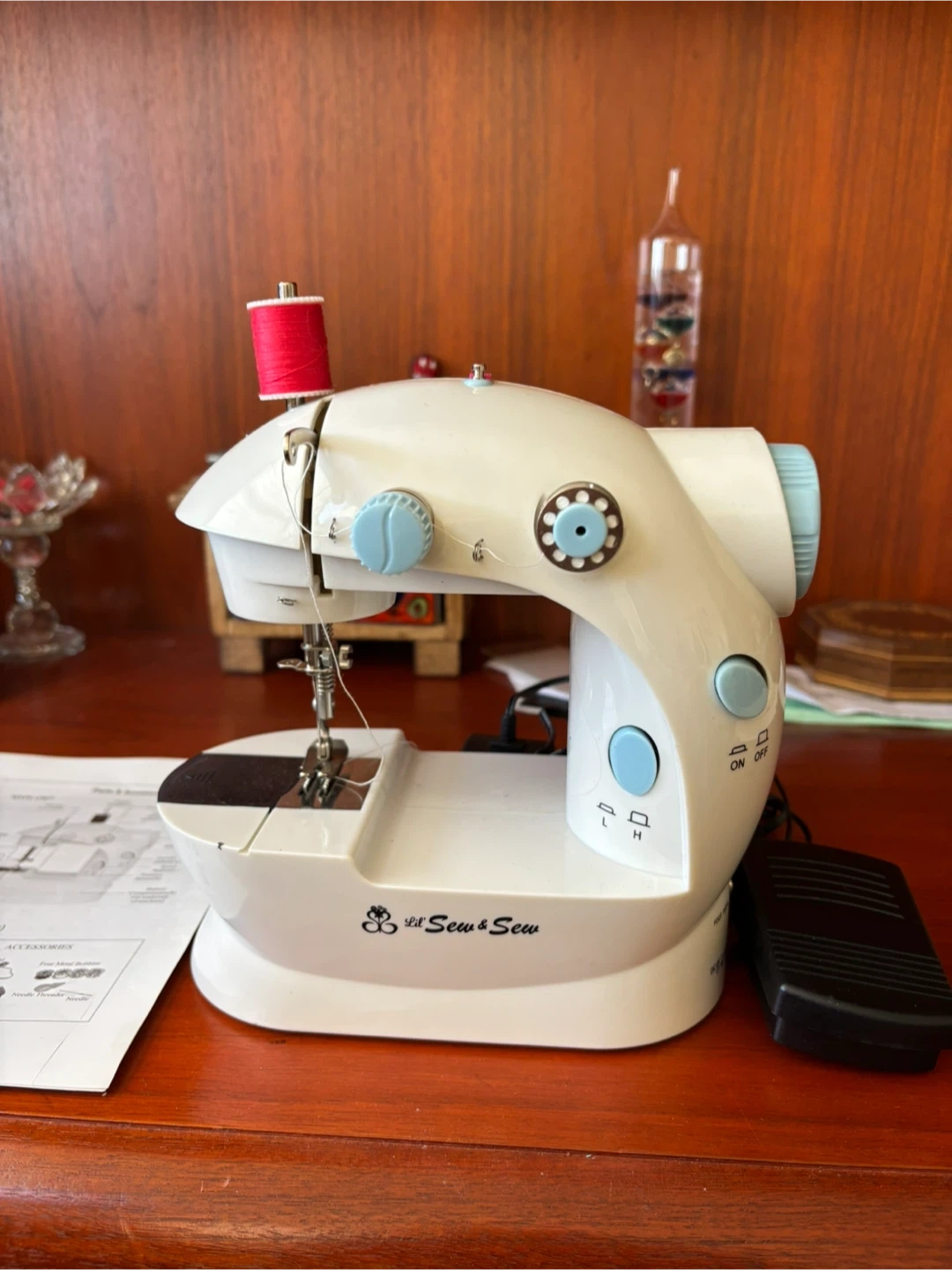 I'm selling a Sew & Sew mini sewing machine. It's compact and easy to use, perfect for small projects and beginners. It comes with a foot pedal and instruction manual.