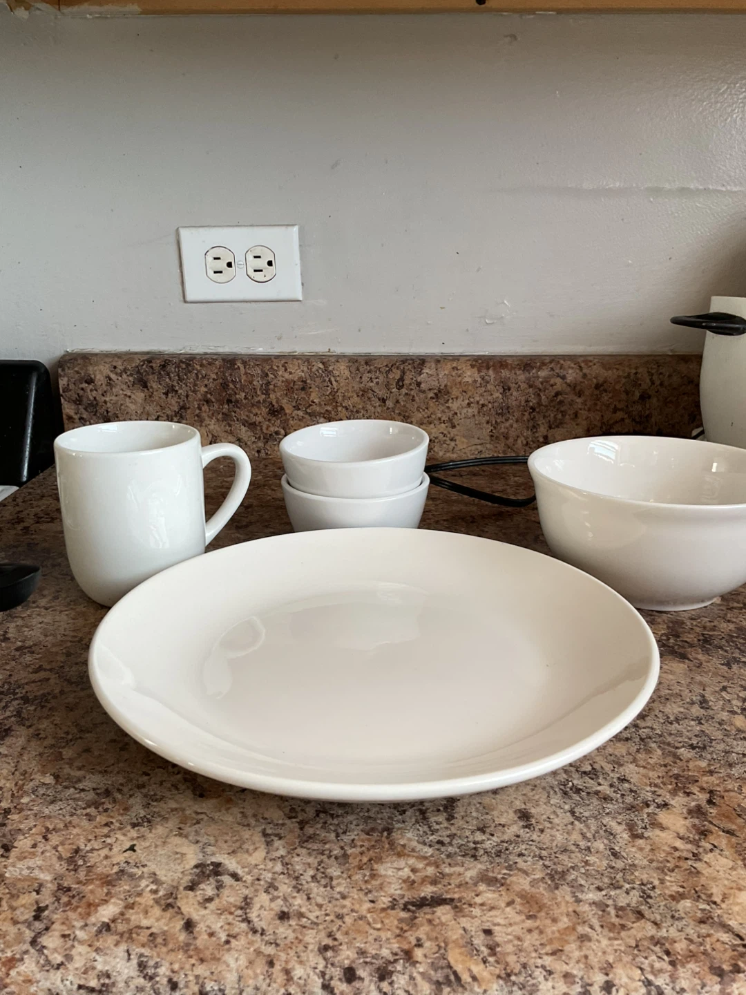 Selling a set of white ceramic dinnerware. Includes a large plate, a mug, a large bowl, and three smaller bowls. Perfect for everyday use!