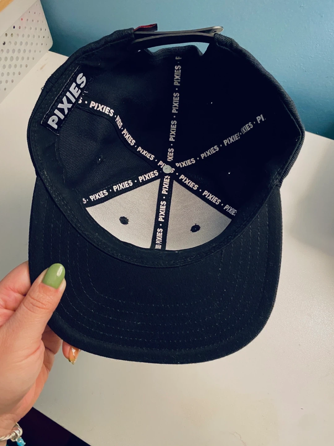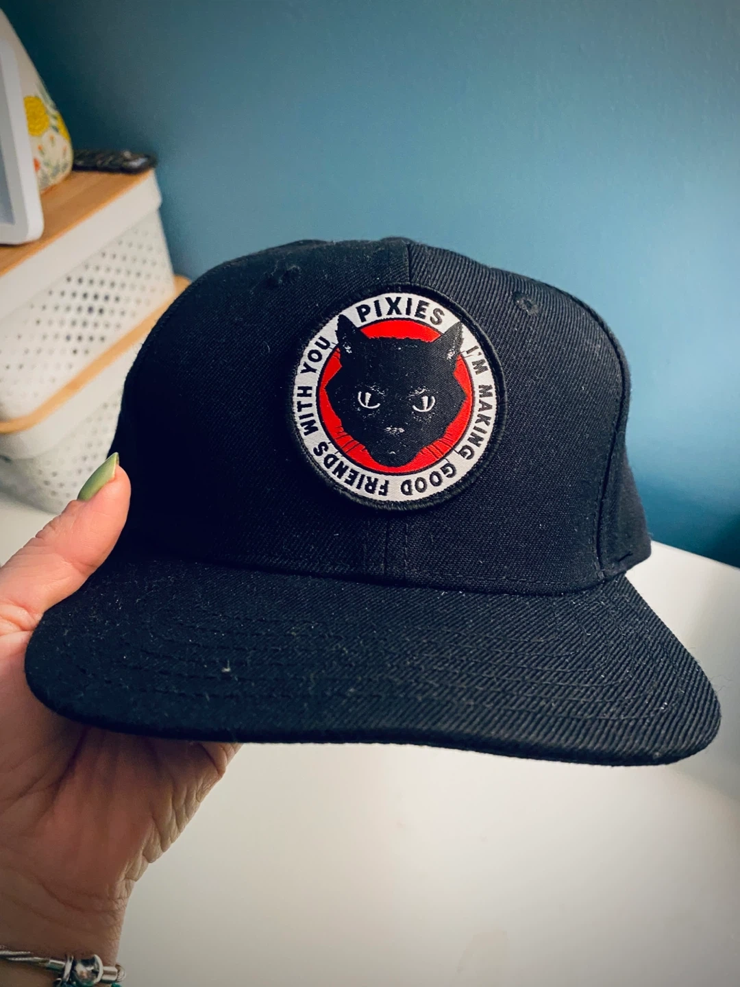 Selling this super cool Pixies hat featuring the iconic black-cat patch on the front. It’s a structured black cap with a flat bill and a bold circular patch that says “I’m Making Good Friends With You – Pixies.”
