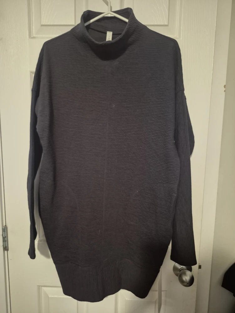 Selling a Lululemon Call for Cozy Dress in size 6! It's a relaxed fit with a high neck and above-the-knee length. Features include thumbholes, front pockets with an interior card sleeve, and Lycra fibre for stretch and shape retention. Made with sweat-wicking and quick-drying cotton blend fabric. The body is 82% cotton, 14% polyester, and 4% Lycra; the pocket lining is 95% cotton and 5% elastane
