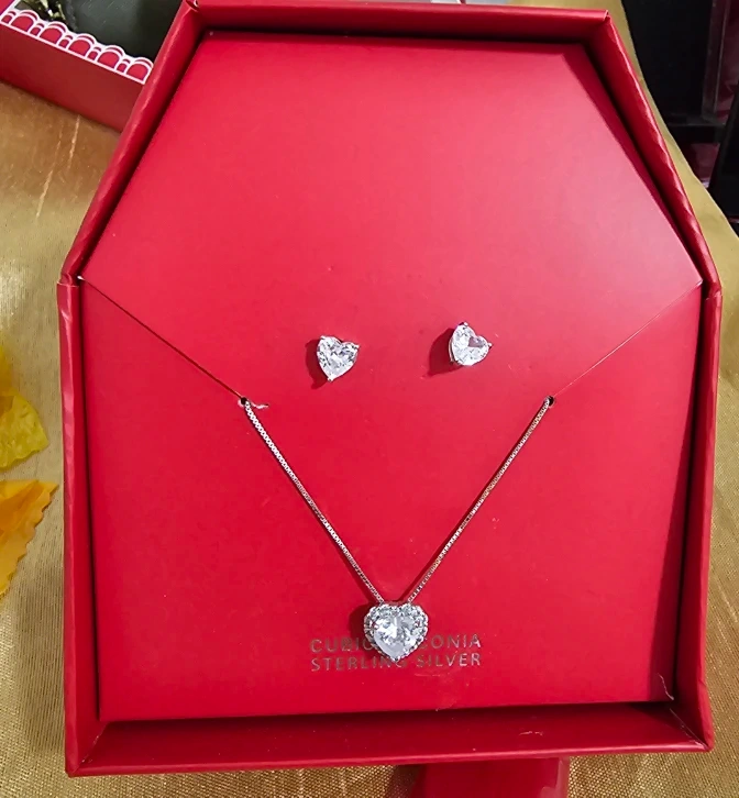 Selling a brand new Cubic Zirconia Sterling Silver heart necklace and earrings set! The set comes in its original red box, perfect for gifting or treating yourself
