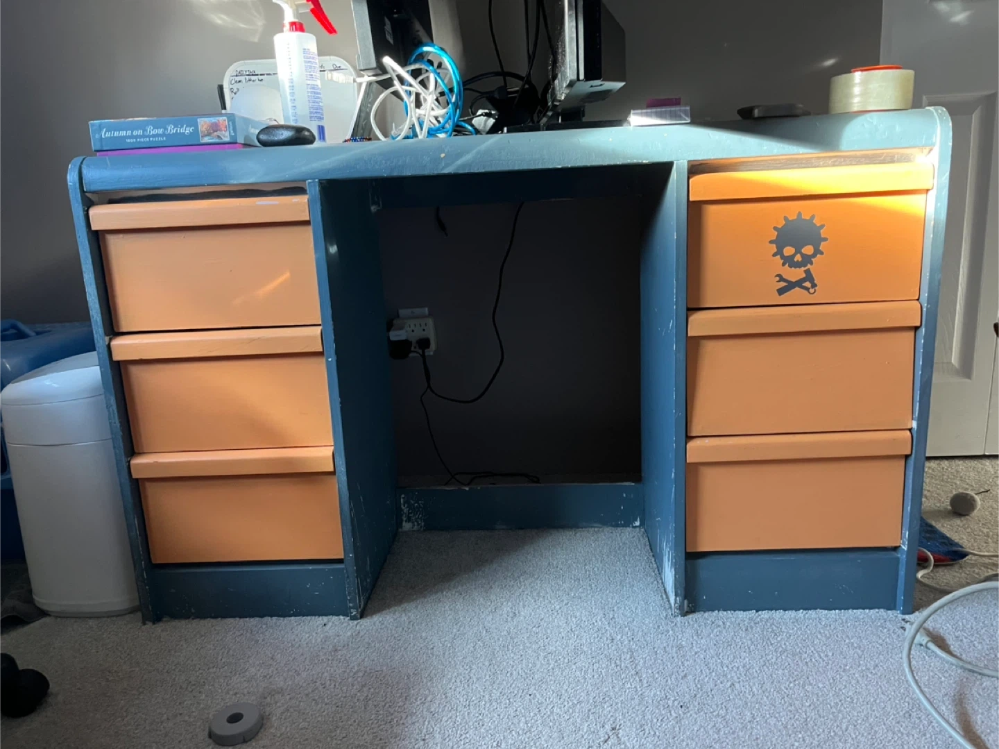 A unique upcycled desk with a blue frame and orange drawers! It's got a fun, quirky vibe with a skull and tools design on one of the drawer sets. Perfect for a school aged kid. Solid wood so if you want to take it to refinish, that’s more than possible.
