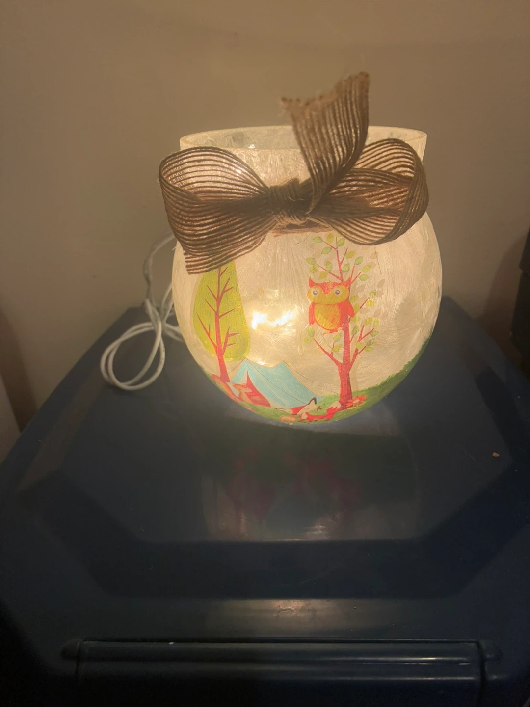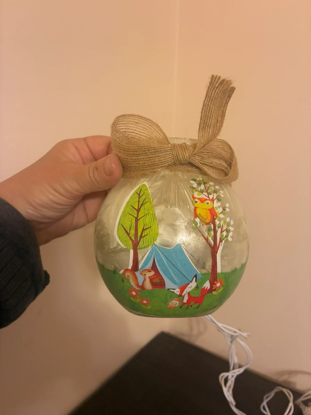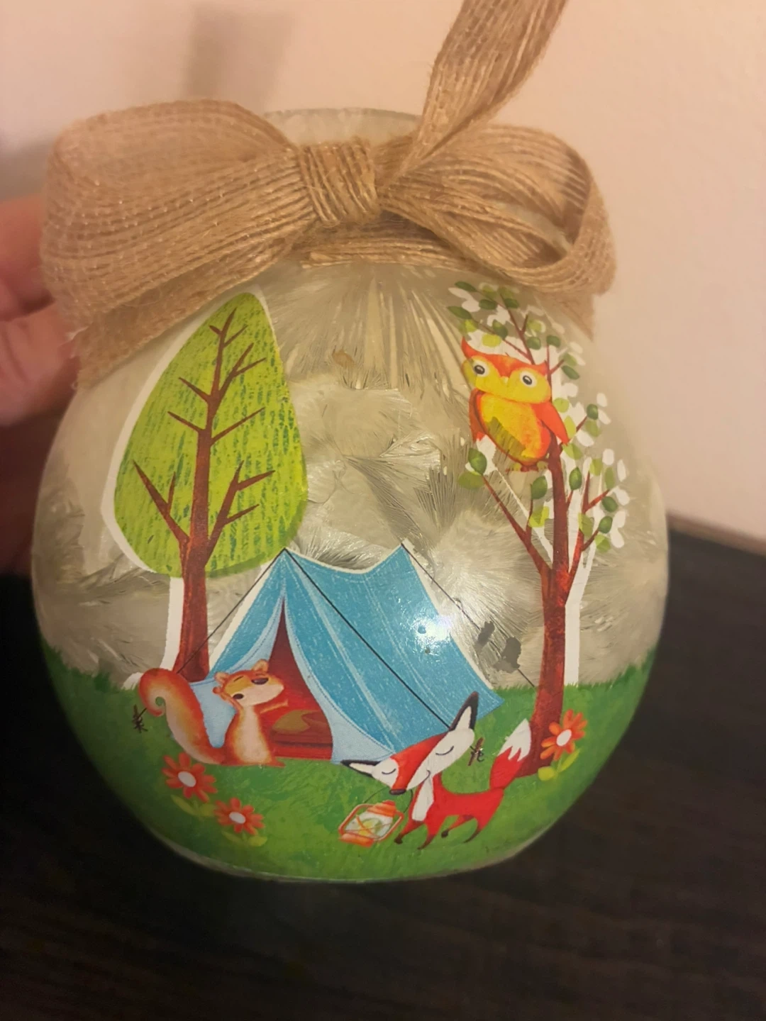 This is a decorative lighted jar featuring a cute camping scene with a squirrel, foxes, and an owl. It has a rustic twine bow and a soft, ambient light, perfect for adding a cozy touch to any room