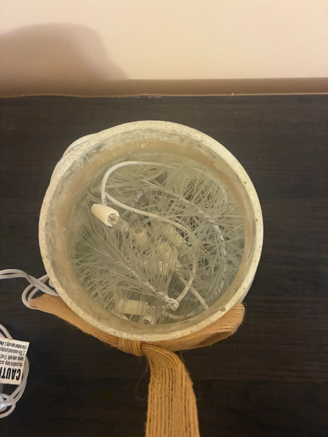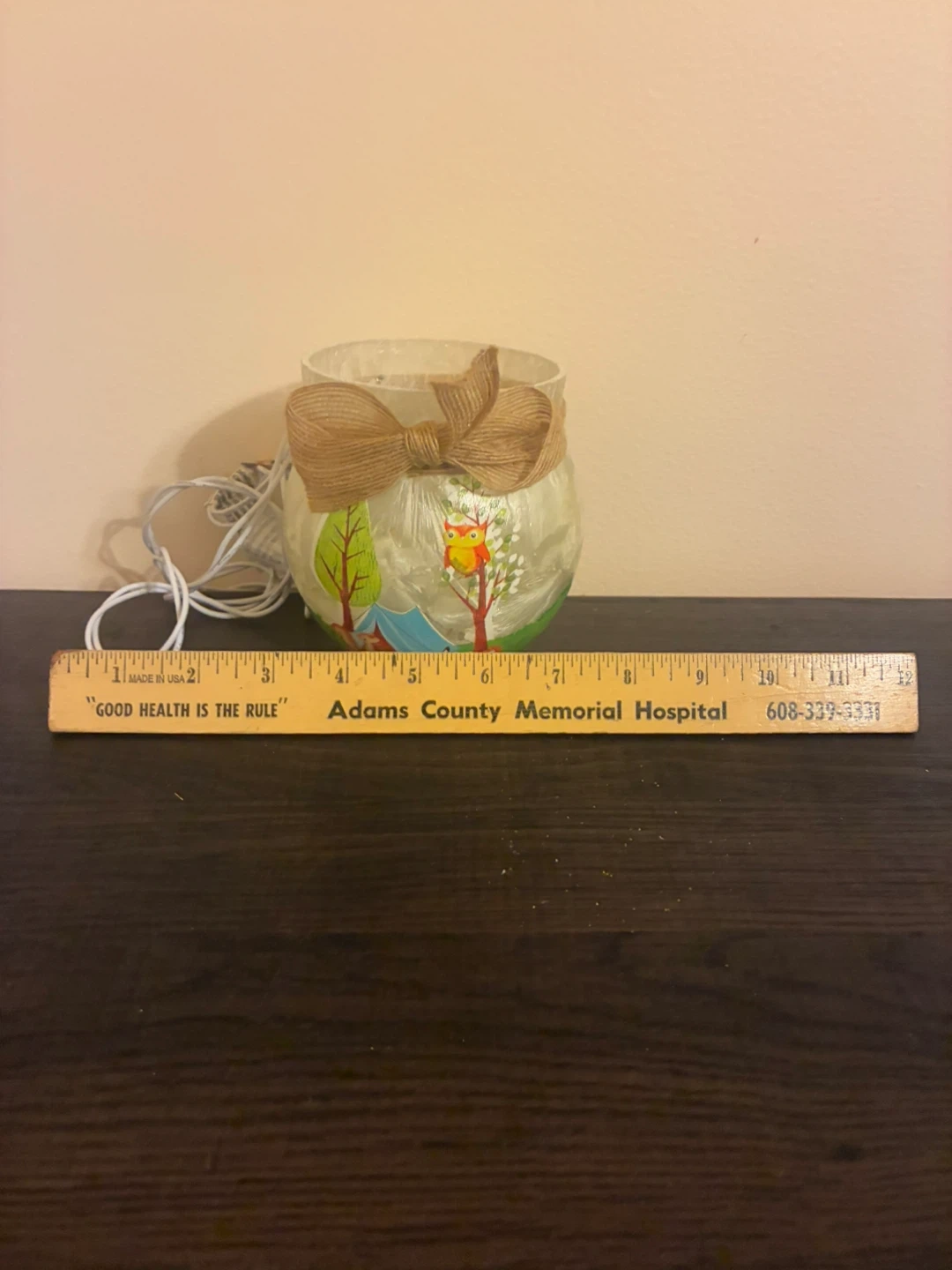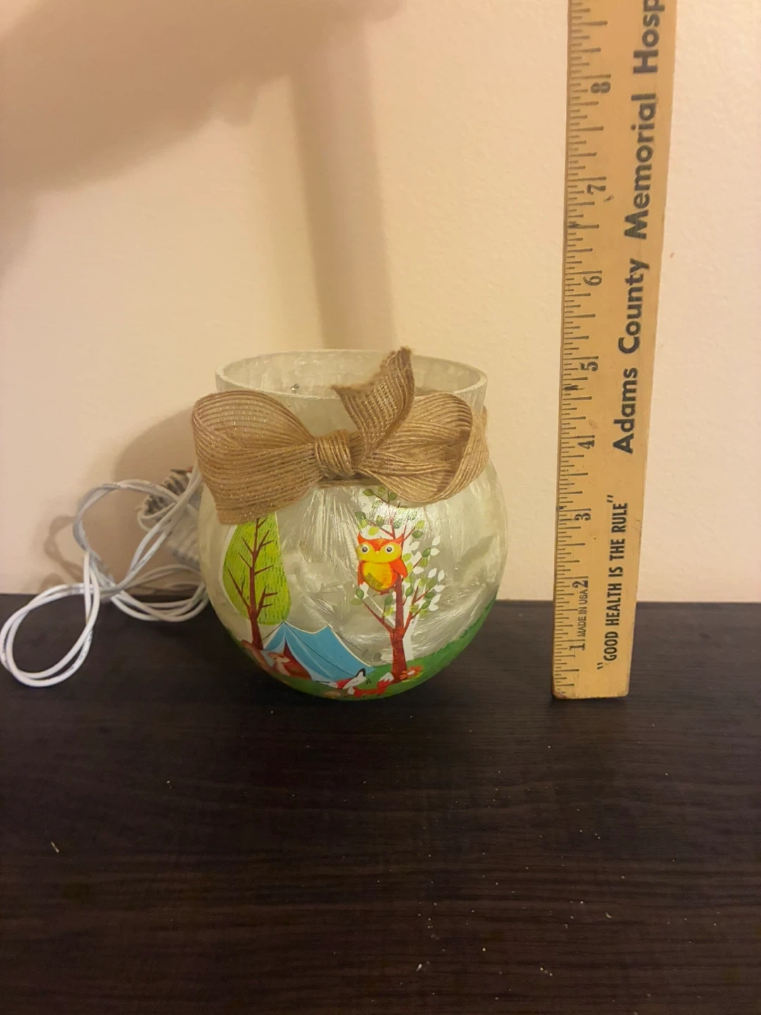 This is a decorative lighted jar featuring a cute camping scene with a squirrel, foxes, and an owl. It has a rustic twine bow and a soft, ambient light, perfect for adding a cozy touch to any room