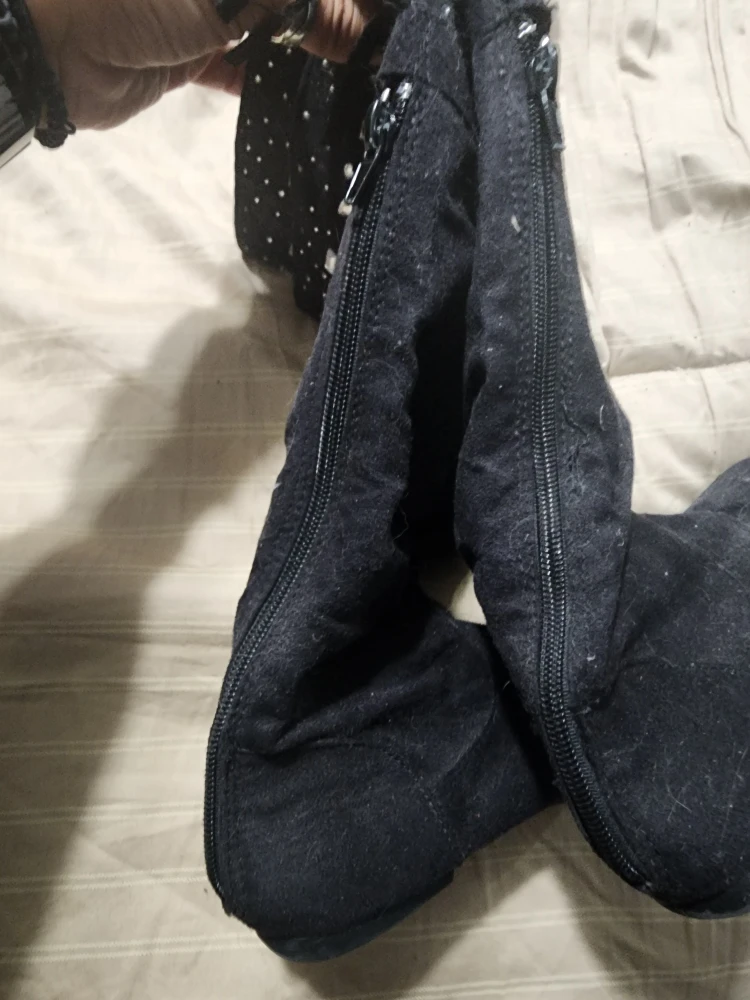 Selling a pair of black boots for girls in size 2! They have some sparkly details at the top and a zip closure on the side. They're in excellent condition and ready for a new owner