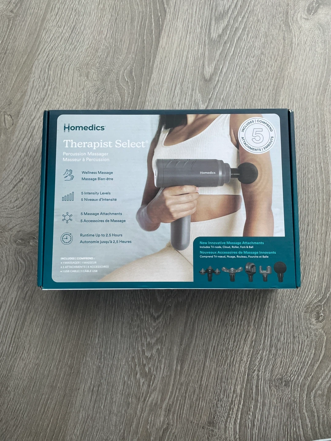 Selling a brand new Homedics Therapist Select Percussion Massager! It features wellness massage and 5 intensity levels. It also comes with 5 massage attachments and has a runtime of up to 2.5 hours. Included in the box are the massager, 5 attachments, and a USB cable. Valued at $130+.