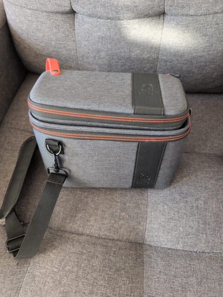 Selling a Nintendo Switch carrying case! It's in great shape and ready to protect your console on the go. It features a shoulder strap for easy carrying and a stylish grey design with black leather accents.