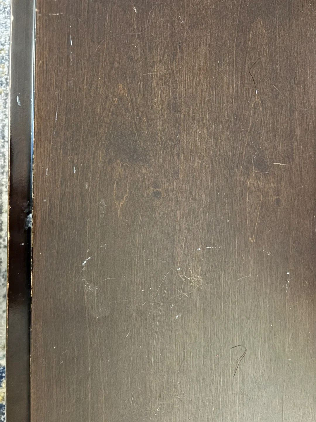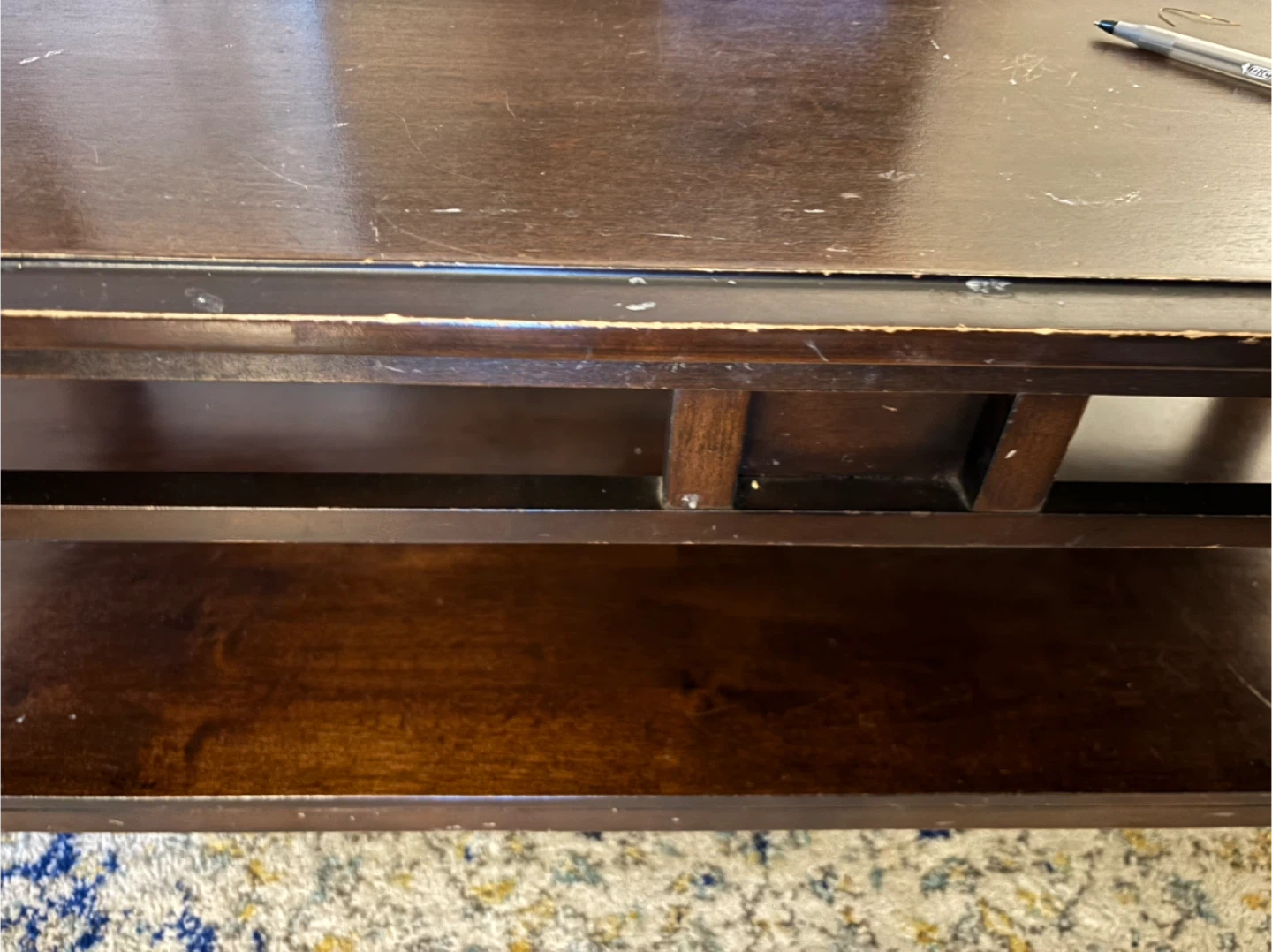 Loveseat has a water stain on one cushion but there are remedies online to remove. Coffee table has scratches (see pictures).