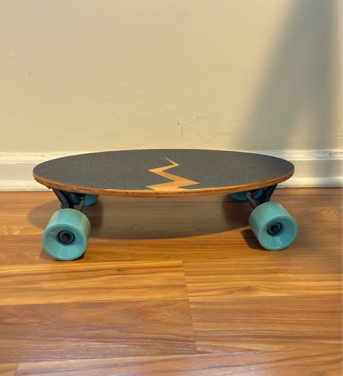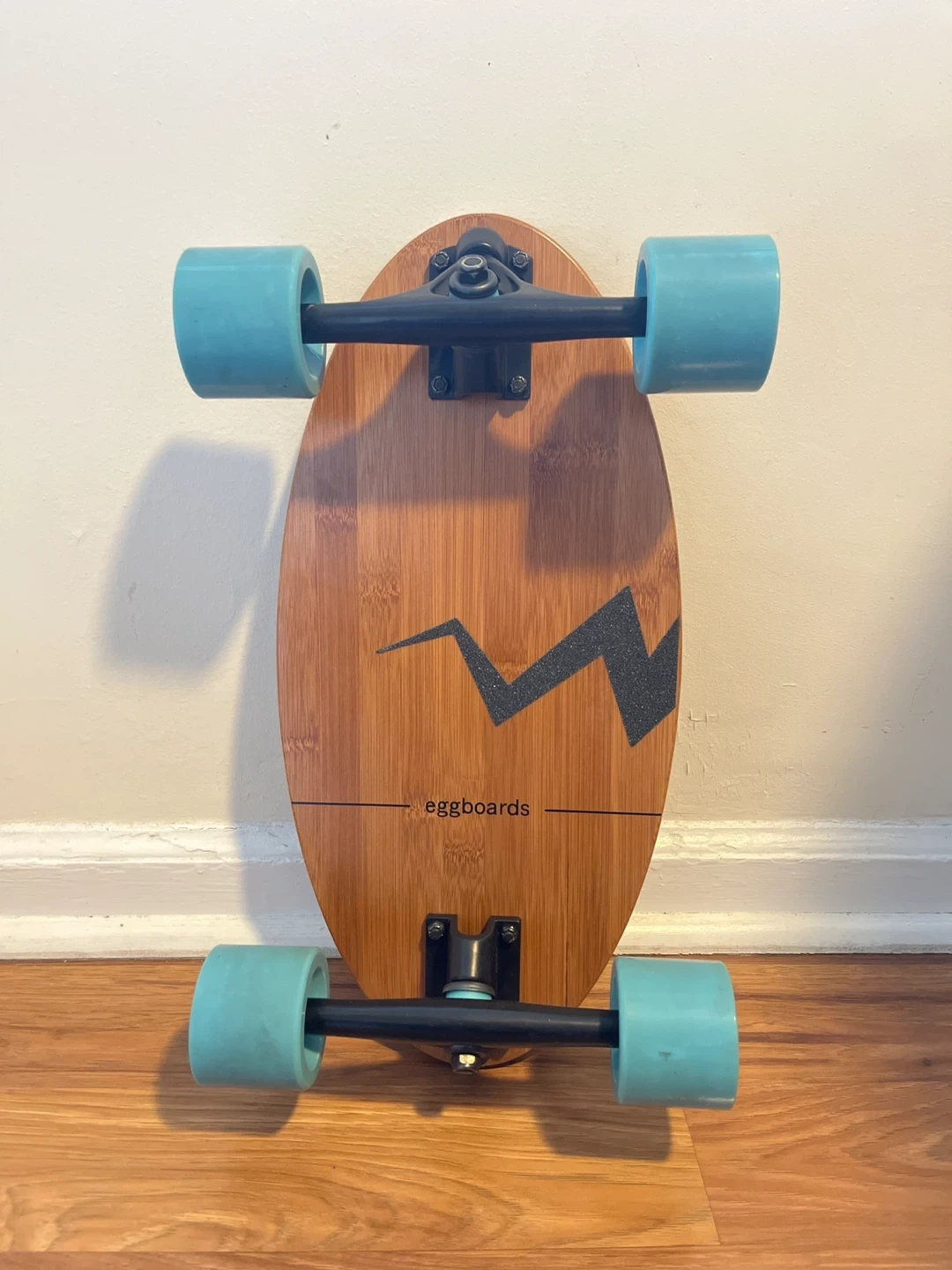 Selling an Eggboards skateboard! It's in great condition and ready for some fun rides. The skateboard features a unique egg-shaped design and smooth turquoise wheels.