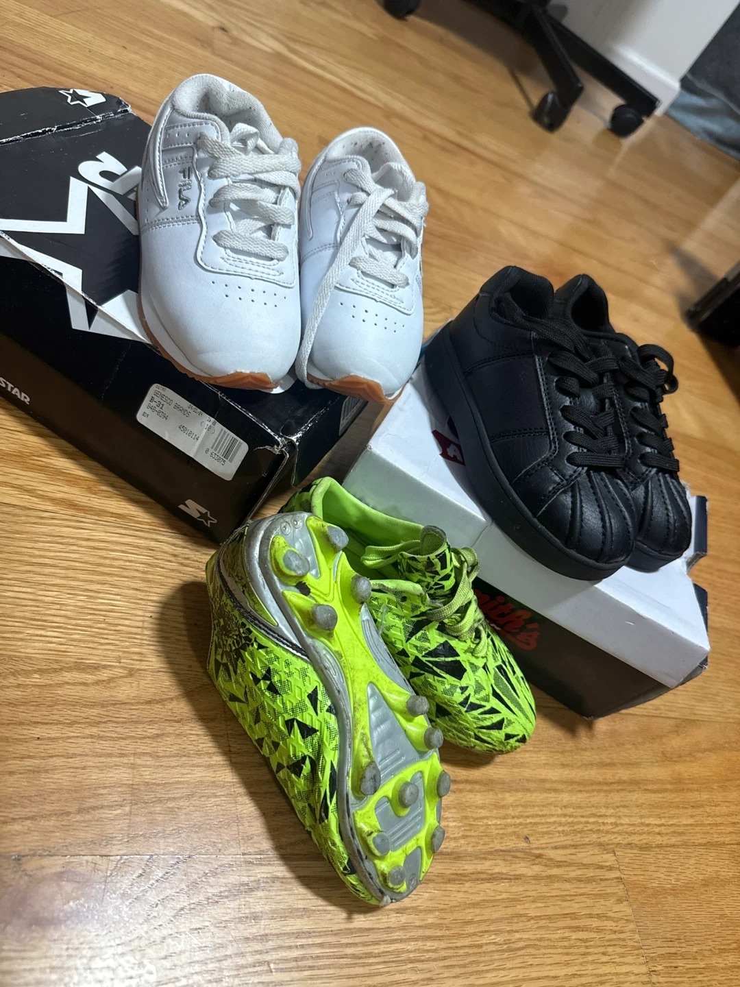 Tengo estos zapatos en muy buenas condiciones los verdes son guayos de fútbol son talla 10 muy poco uso lo que deseen darme por ellos! Escríbanme