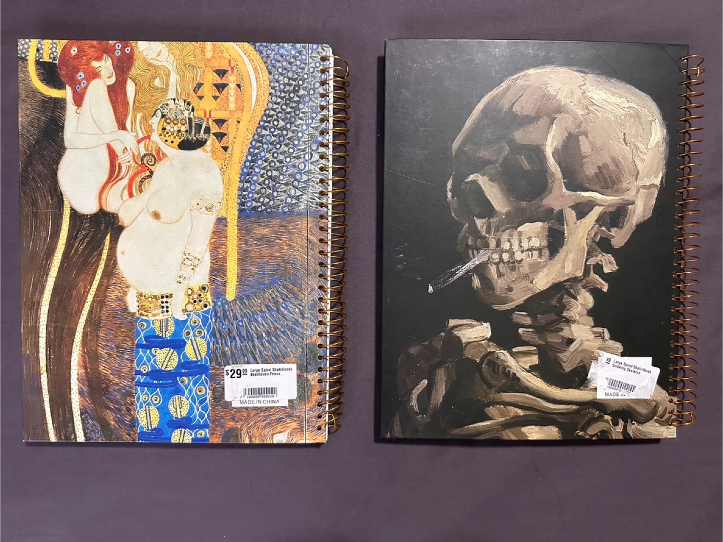 Selling two spiral sketchbooks with unique covers. One features Klimt's 'Danae' and the other has Van Gogh's 'Skull of a Skeleton with Burning Cigarette'. Originally bought for $29 each