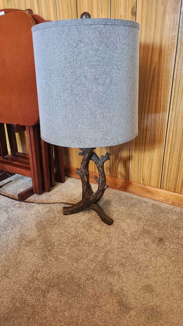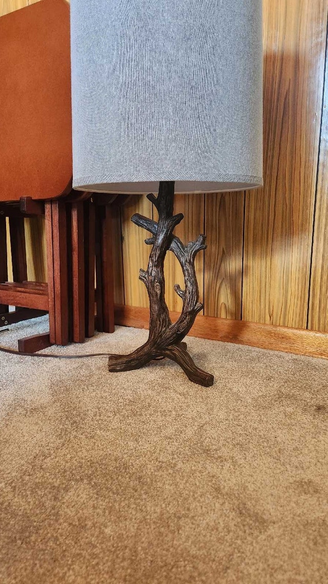 Add a touch of rustic charm to your home with this unique table lamp! Featuring a tree branch-inspired base and a neutral-toned shade, this lamp is perfect for adding warm light to any room. It's in good condition and ready to brighten up your space. Specifications: