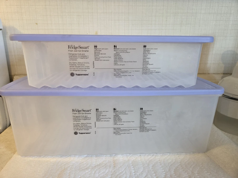 Selling a couple of Tupperware FridgeSmart containers! These are great for keeping your fruits and veggies fresh longer in the fridge. They help you organize your produce and keep it in good condition
