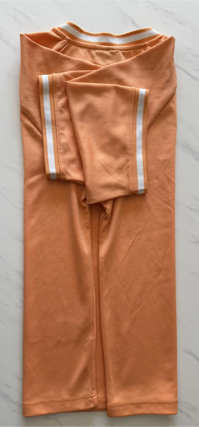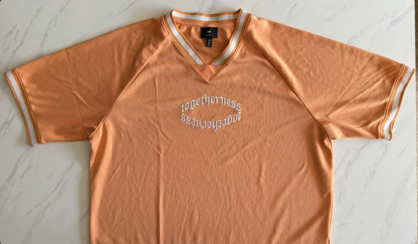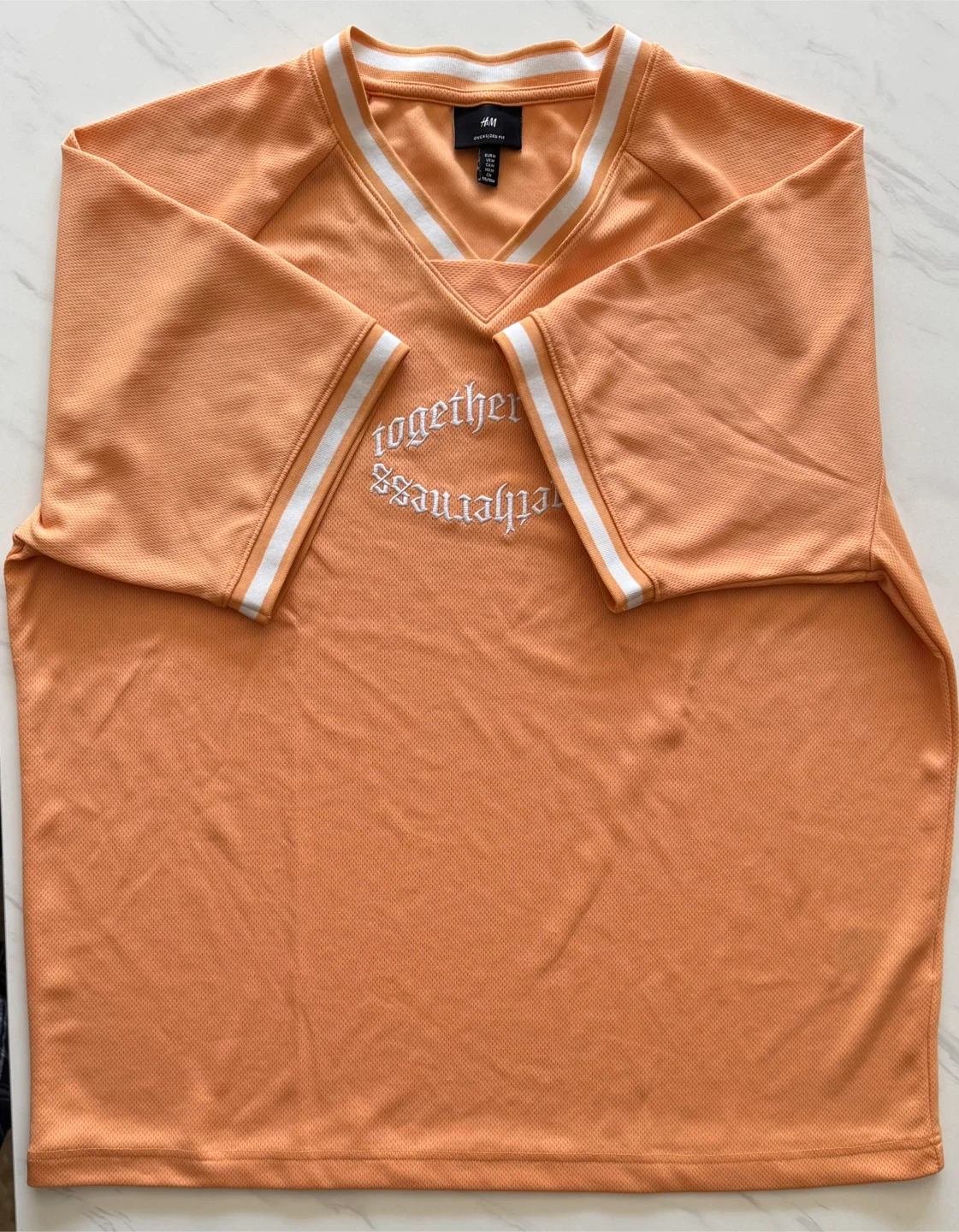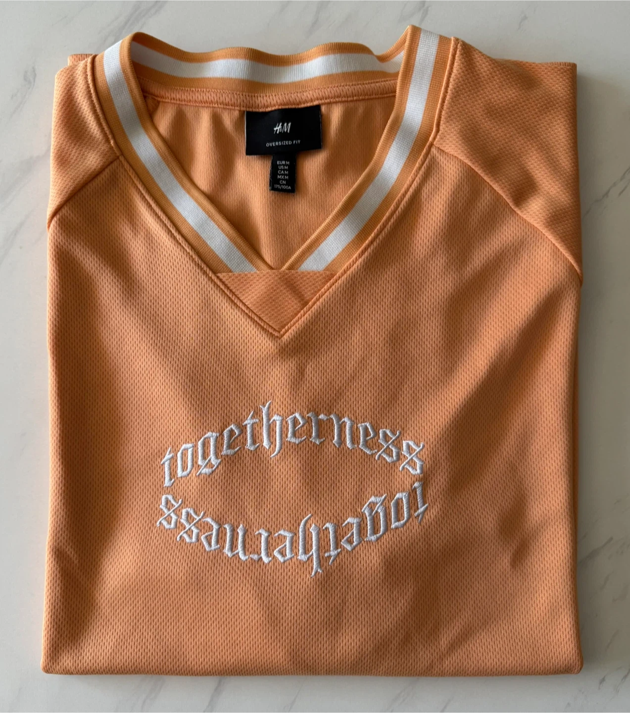 Selling a cute H&M oversized fit t-shirt! It's a peach color and size M. The shirt has a V-neck with white stripes and the word 'togetherness' embroidered on the front