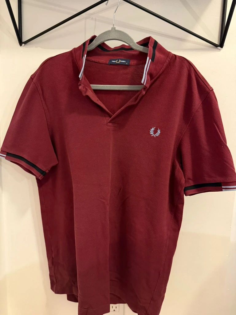 Selling a Fred Perry polo shirt in a lovely burgundy colour! It's a size XL and in great condition. The collar and sleeves have a nice striped detail. Perfect for a casual yet stylish look!